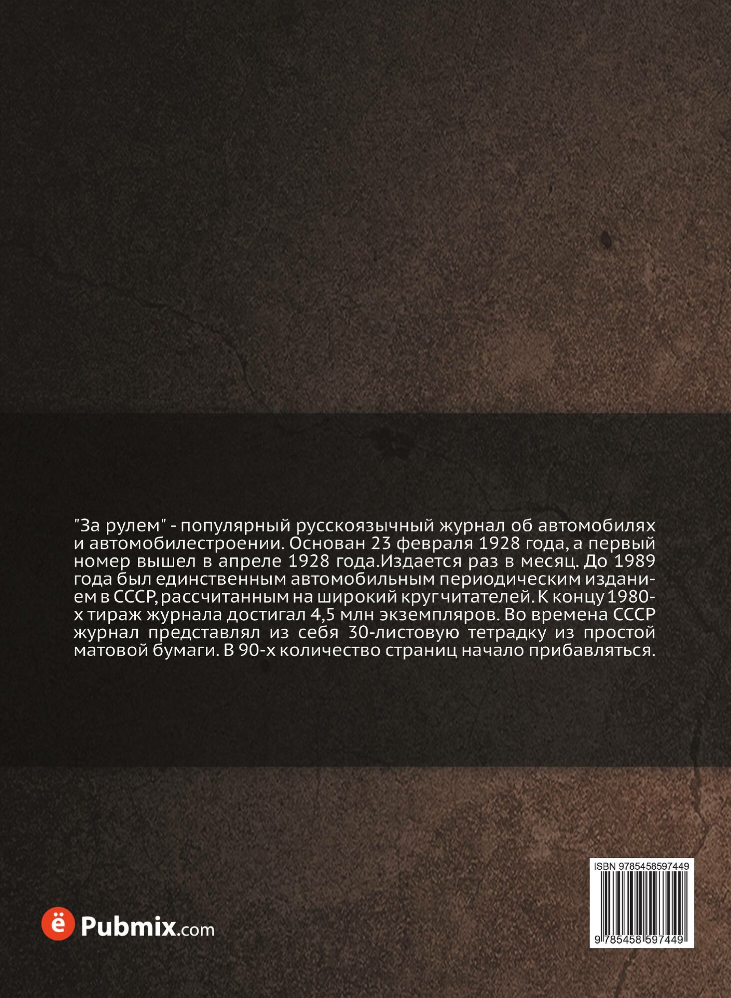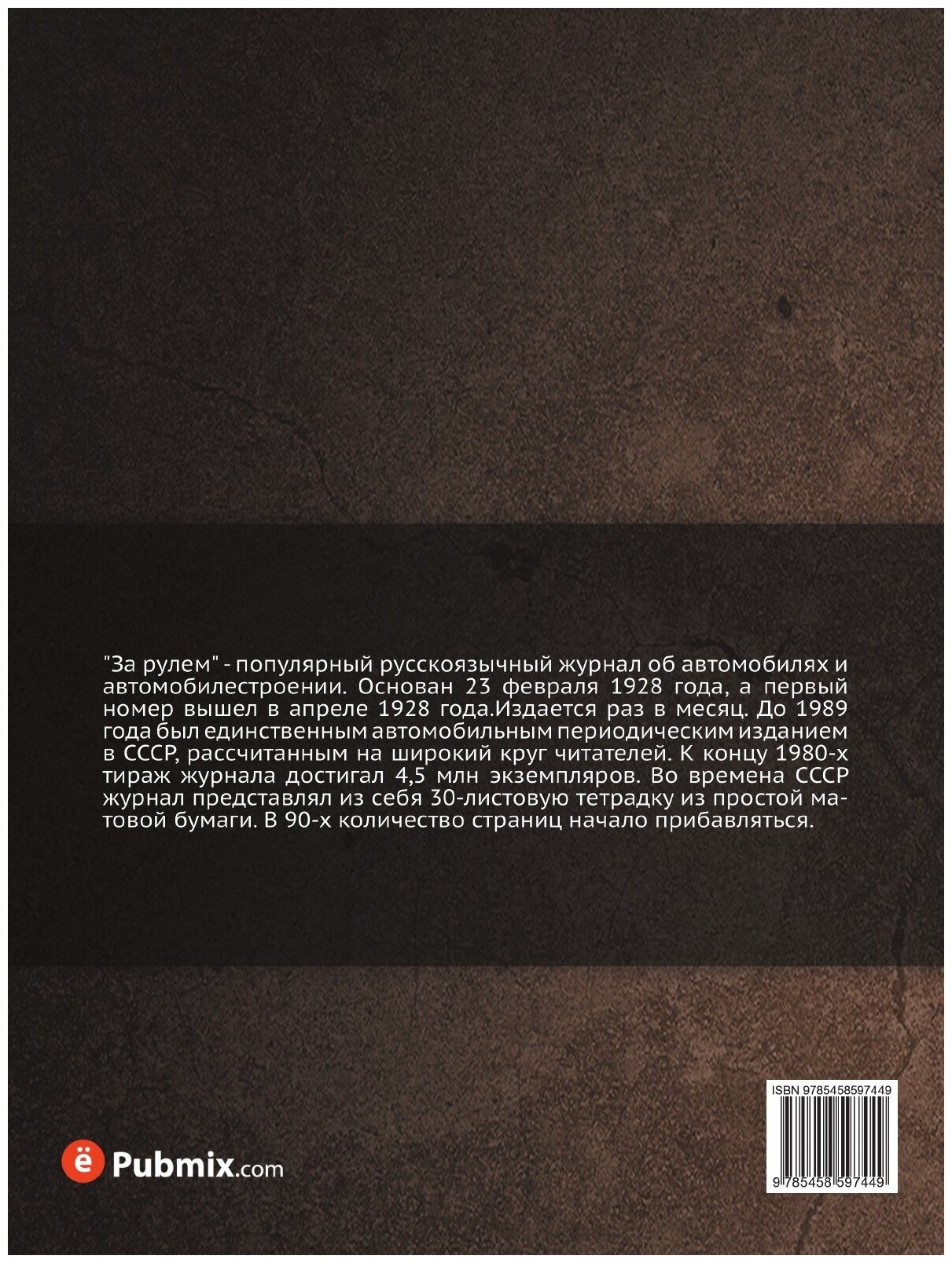 "За рулем" - популярный русскоязычный журнал об автомобилях и автомобилестроении. Основан 23 февраля 1928 года, а первый номер вышел в апреле 1928 года.Издается раз в месяц. До 1989 года был единственным автомобильным периодическим изданием в СССР, рассчитанным на широкий круг читателей. К концу 1980-х тираж журнала достигал 4,5 млн экземпляров. Во времена СССР журнал представлял из себя 30-листовую тетрадку из простой матовой бумаги. В 90-х количество страниц начало прибавляться.