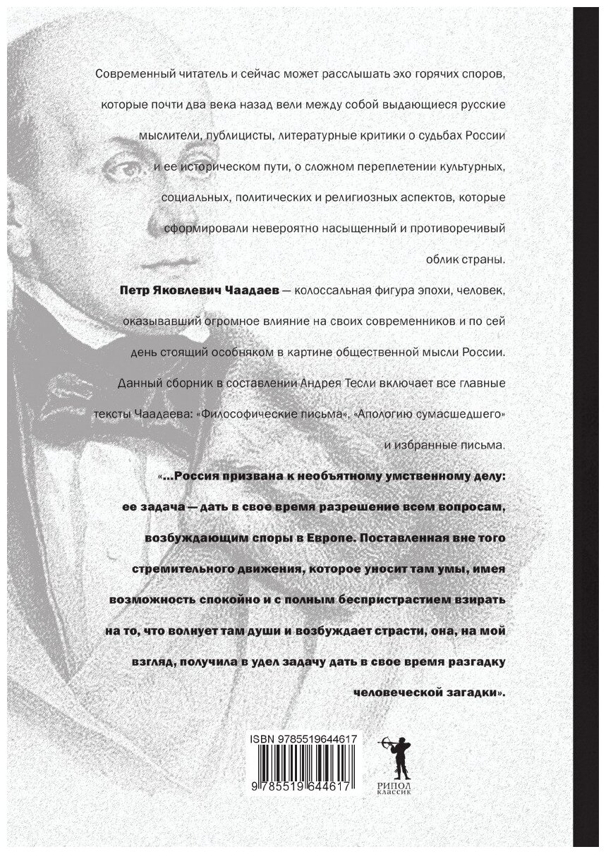 Петр Яковлевич Чаадаев - колоссальная фигура эпохи, человек, оказывавший огромное влияние на своих современников и по сей день стоящий особняком в картине общественной мысли России. Данный сборник включает себя все главные тексты Чаадаева: "Философические письма", "Апологию сумасшедшего" и избранные письма.
