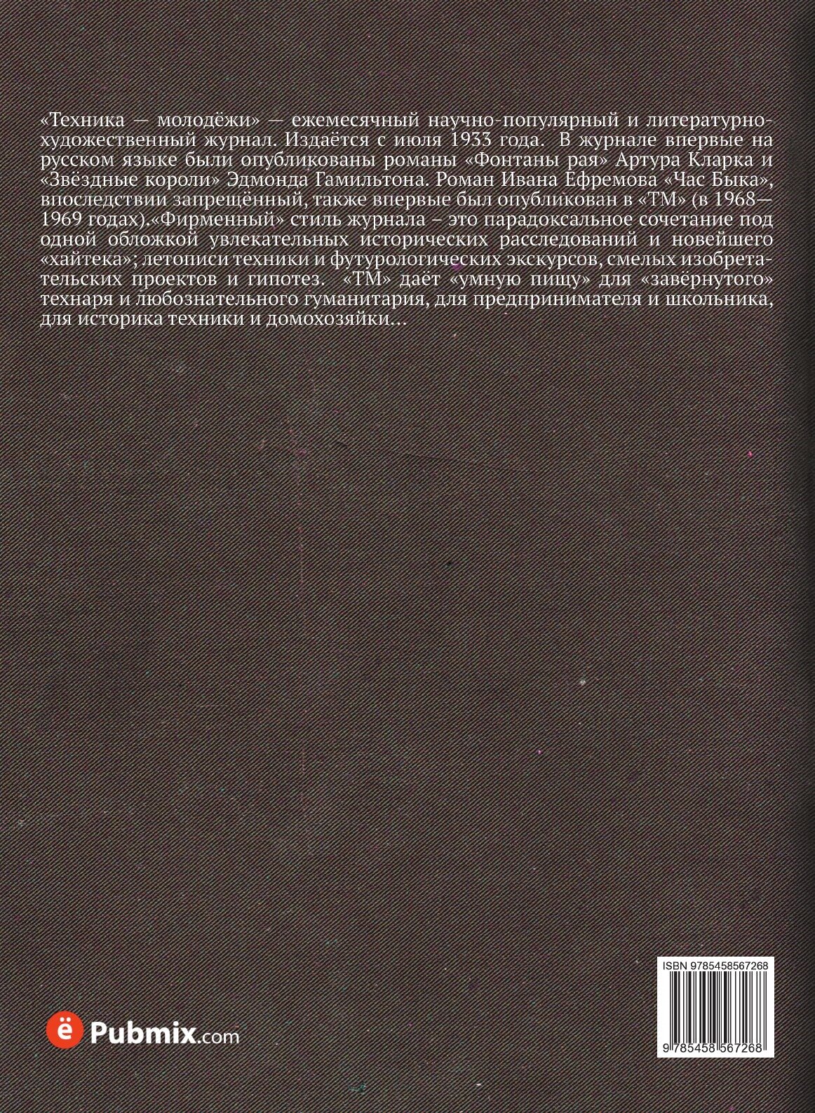 «Техника — молодёжи» — ежемесячный научно-популярный и литературно-художественный журнал. Издаётся с июля 1933 года. В журнале впервые на русском языке были опубликованы романы «Фонтаны рая» Артура Кларка и «Звёздные короли» Эдмонда Гамильтона. Роман Ивана Ефремова «Час Быка», впоследствии запрещённый, также впервые был опубликован в «ТМ» (в 1968—1969 годах).«Фирменный» стиль журнала – это парадоксальное сочетание под одной обложкой увлекательных исторических расследований и новейшего «хайтека»; летописи техники и футурологических экскурсов, смелых изобретательских проектов и гипотез. «ТМ» даёт «умную пищу» для «завёрнутого» технаря и любознательного гуманитария, для предпринимателя и школьника, для историка техники и домохозяйки…