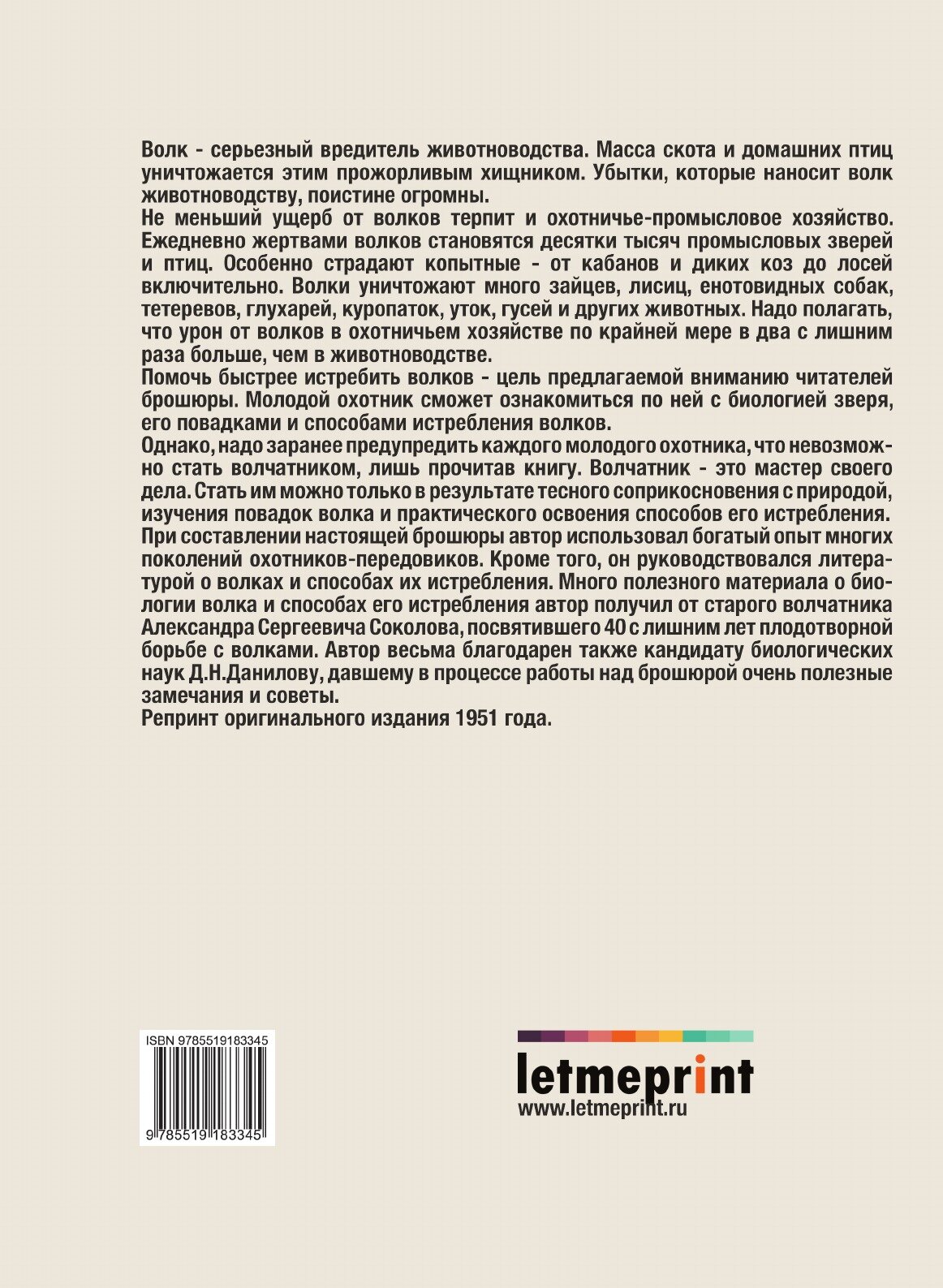 При составлении настоящей брошюры автор использовал богатый опыт многих поколений охотников-передовиков. Кроме того, он руководствовался литературой о волках и способах их истребления. Много полезного материала о биологии волка и способах его истребления автор получил от старого волчатника Александра Сергеевича Соколова, посвятившего 40 с лишним лет плодотворной борьбе с волками. Автор весьма благодарен также кандидату биологических наук Д.Н.Данилову, давшему в процессе работы над брошюрой очень полезные замечания и советы.