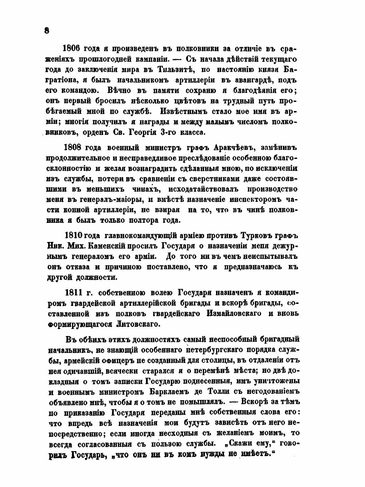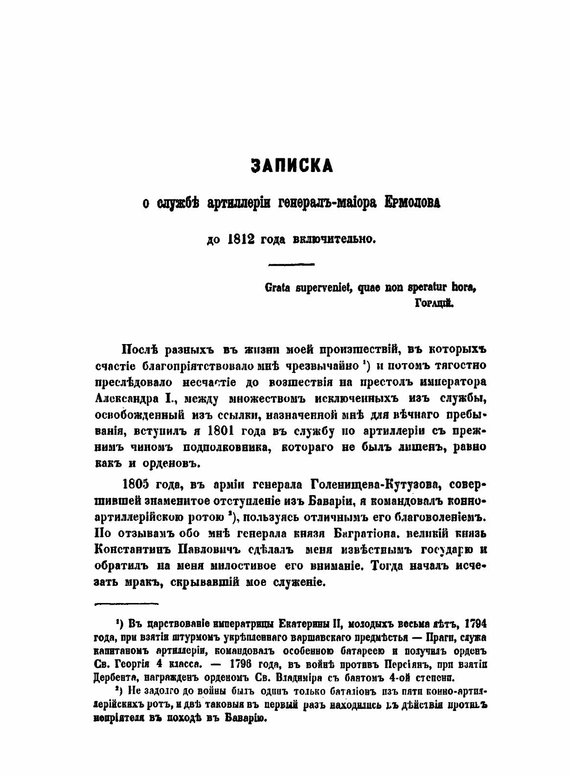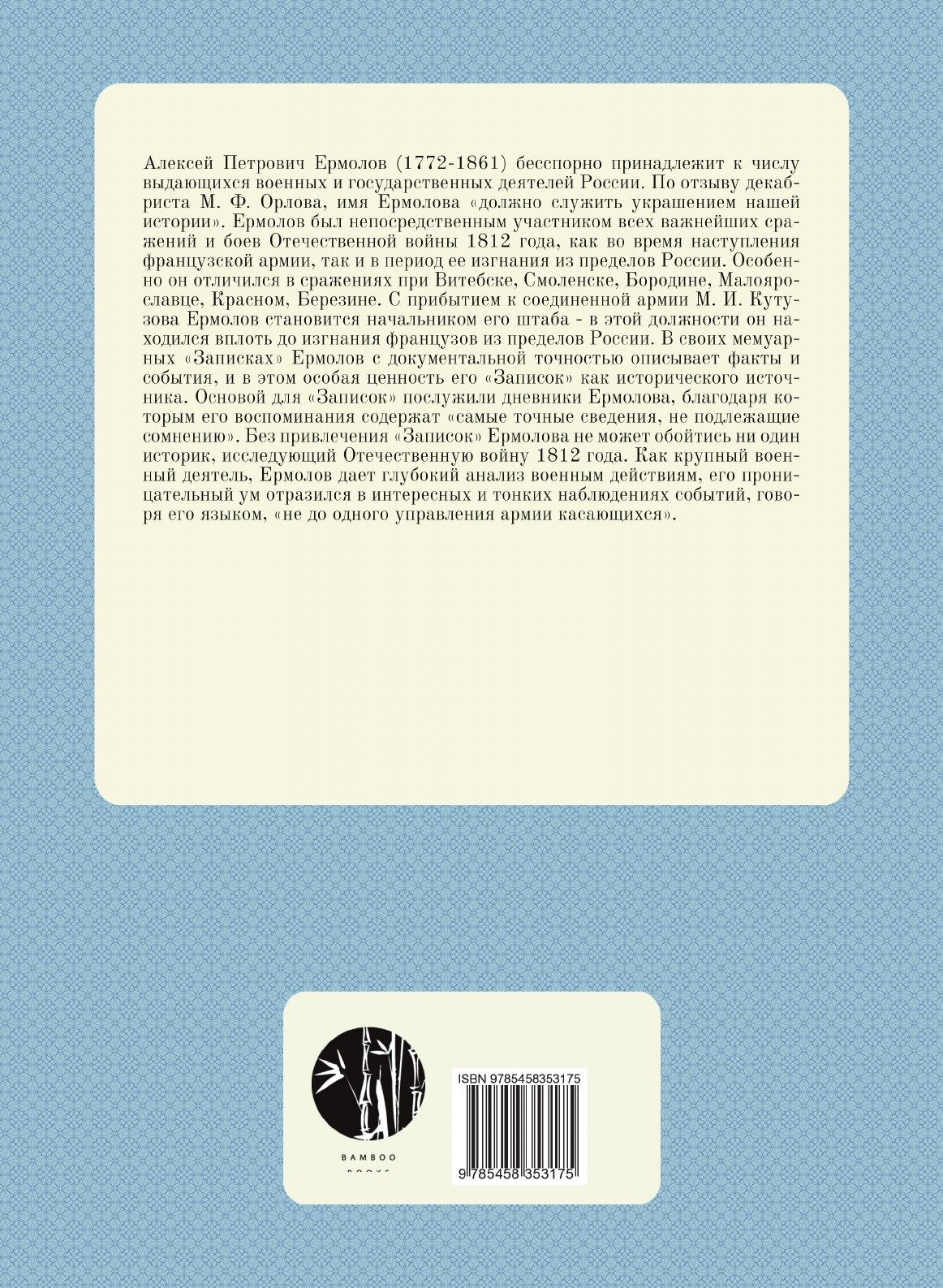 Алексей Петрович Ермолов (1772-1861) бесспорно принадлежит к числу выдающихся военных и государственных деятелей России. По отзыву декабриста М. Ф. Орлова, имя Ермолова «должно служить украшением нашей истории».Ермолов был непосредственным участником всех важнейших сражений и боев Отечественной войны 1812 года, как во время наступления французской армии, так и в период ее изгнания из пределов России. Особенно он отличился в сражениях при Витебске, Смоленске, Бородине, Малоярославце, Красном, Березине. С прибытием к соединенной армии М. И. Кутузова Ермолов становится начальником его штаба - в этой должности он находился вплоть до изгнания французов из пределов России.В своих мемуарных «Записках» Ермолов с документальной точностью описывает факты и события, и в этом особая ценность его «Записок» как исторического источника. Основой для «Записок» послужили дневники Ермолова, благодаря которым его воспоминания содержат «самые точные сведения, не подлежащие сомнению». Без привлечения «Записок» Ермолова не может обойтись ни один историк, исследующий Отечественную войну 1812 года. Как крупный военный деятель, Ермолов дает глубокий анализ военным действиям, его проницательный ум отразился в интересных и тонких наблюдениях событий, говоря его языком, «не до одного управления армии касающихся».
