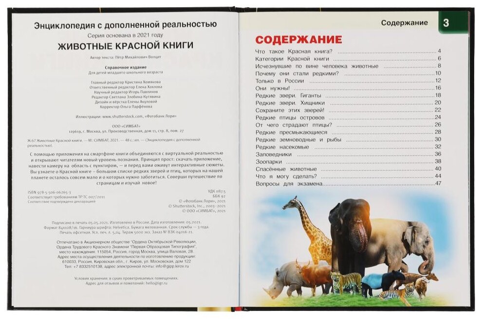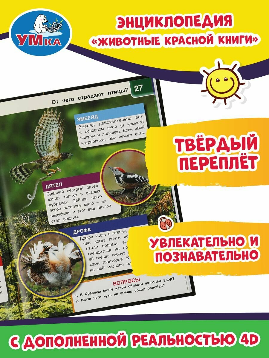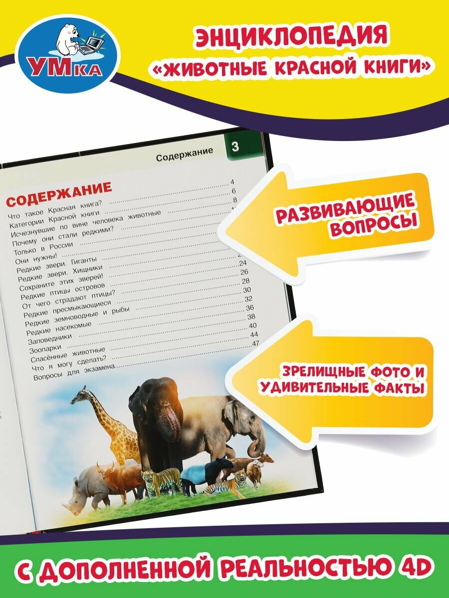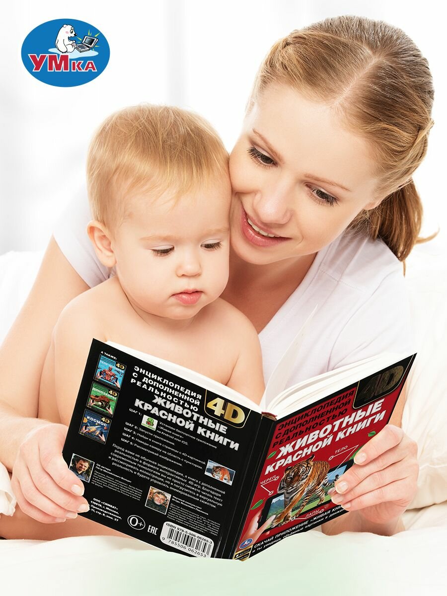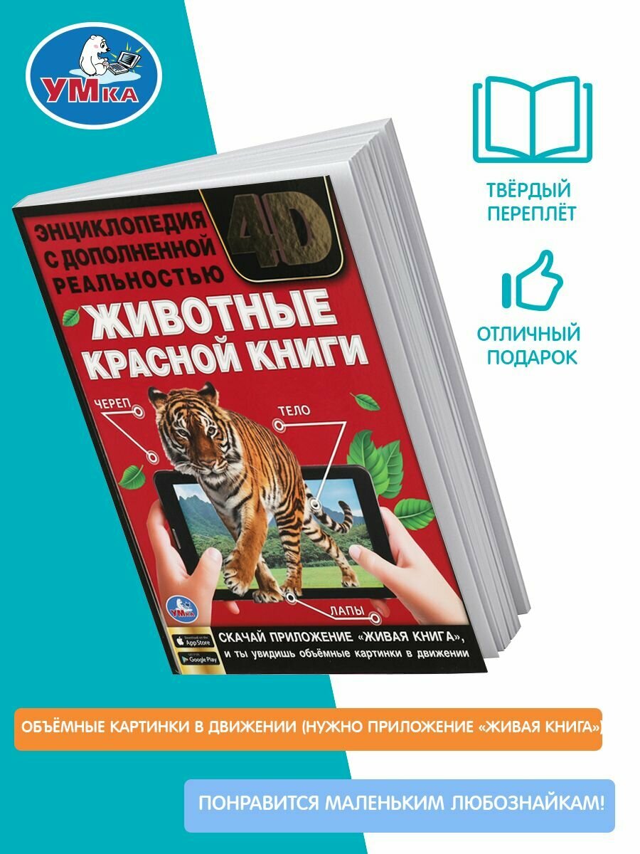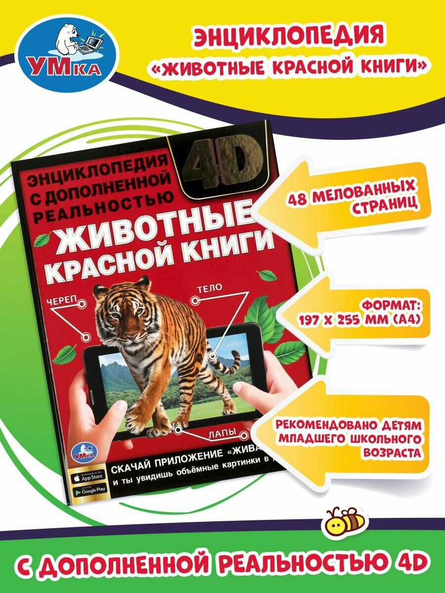 Энциклопедия с дополненной реальностью 4D «Животные Красной книги» ТМ «УМка» обязательно понравится маленьким любознайкам:- объёмные картинки в движении (нужно приложение «Живая книга»)- увлекательно и познавательно- красочные иллюстрации- развивающие вопросы- твёрдый переплётЭта занимательная энциклопедия расскажет юному читателю, какие животные занесены в Красную книгу, почему и что нужно делать, чтобы их сохранить. Для большей наглядности книга оснащена технологией дополненной реальности, для её работы необходимо установить специальное приложение. При наведении камеры телефона на отмеченную пунктиром область страницы читатель погрузится в виртуальную реальность и сможет управлять анимированным сюжетом. Такой способ подачи материала в совокупности с яркими иллюстрациями и удивительными фактами увлечёт ребёнка и поможет ему быстро, эффективно и с удовольствием усвоить новую информацию.Чтение энциклопедии ТМ «УМка» способствует расширению кругозора и развитию:- визуального восприятия- внимания- памяти- усидчивостиОбъём: 48 стр. Формат: 197 х 255 мм (А4).Материал: офсетная бумага, мелованная.Рекомендовано детям младшего школьного возраста.