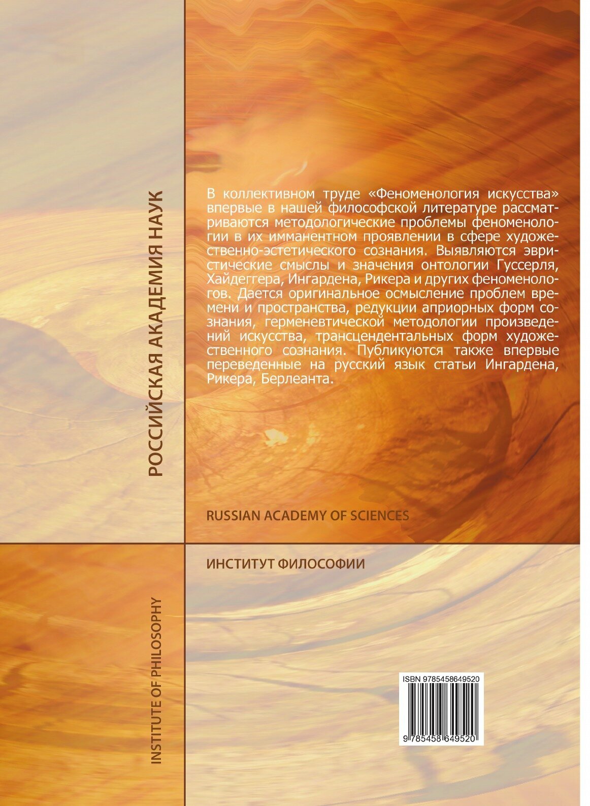 Эта книга - репринт оригинального издания 1996 года, созданный на основе электронной копии высокого разрешения, которую очистили и обработали вручную, сохранив структуру и орфографию оригинального издания. Редкие, забытые и малоизвестные книги, изданные с петровских времен до наших дней, вновь доступны в виде печатных книг. В коллективном труде «Феноменология искусства» впервые в нашей философской литературе рассматриваются методологические проблемы феноменологии в их имманентном проявлении в сфере художественно-эстетического сознания. Выявляются эвристические смыслы и значения онтологии Гуссерля, Хайдеггера, Ингардена, Рикера и других феноменологов. Дается оригинальное осмысление проблем времени и пространства, редукции априорных форм сознания, герменевтической методологии произведений искусства, трансцендентальных форм художественного сознания. Публикуются также впервые переведенные на русский язык статьи Ингардена, Рикера, Берлеанта.