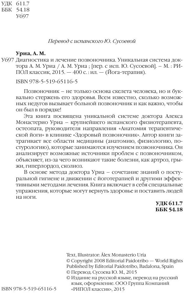 Позвоночник - не только основа скелета человека, но и буквально стержень его здоровья. Всем известно, сколько возможных недугов вызывает больной позвоночник и как важно, чтобы он был в порядке! Эта книга посвящена уникальной системе доктора Алекса Монастерио Уриа - крупнейшего испанского физиотерапевта, остеопата, руководителя направления "Анатомия терапевтической йоги" в клинике "Здоровый позвоночник". Автор книги затрагивает вес области медицины (анатомию, физиологию, постурологию), которые занимаются изучением позвоночника. Он анализирует возможные источники проблем с позвоночником, объясняет, из-за чего возникают такие болезни, как артроз, грыжи, гиперлордоз, сколиоз. В основе метода доктора Уриа - сочетание знаний о постуральной гигиене и движении с йоготерапией и другими эффективными методами лечения. Книга… включает в себя специальные упражнения, которые могут вернуть здоровье и поставить людей на ноги.