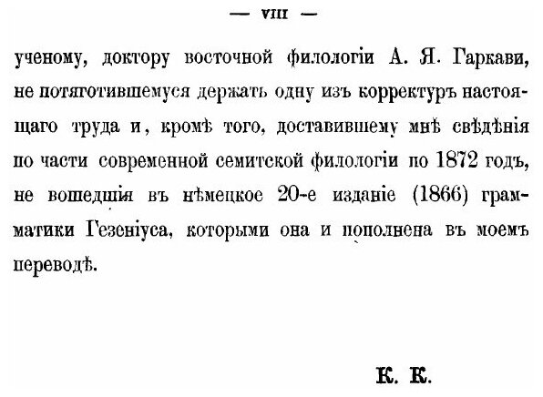 Еврейская грамматика Гезениуса бесспорно занимает в настоящее время первое место между учебниками еврейского языка (иврит), не только в Германии, но и везде, где преподавание этого языка входит в состав предметов, признаваемых необходимыми для высшего образования.Своим необыкновенным успехом грамматика Гезениуса обязана тому обстоятельству, что она с простым материалом учебника соединяет и высшие филологические сведения об еврейском языке, добытые современной наукой, и что она не оставляет, таким образом, учащегося только при вещественном, так сказать, запасе форм, усваиваемых памятью, но, в то же время, дает ему возможность понимать и историческое их значение