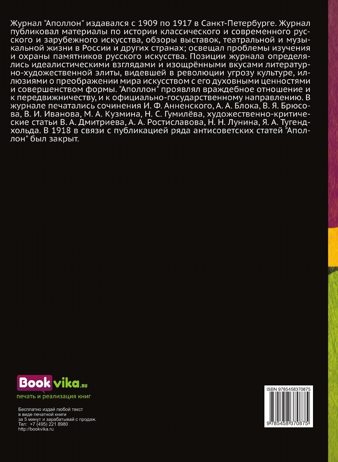 Журнал "Аполлон" издавался с 1909 по 1917 в Санкт-Петербурге. Журнал публиковал материалы по истории классического и современного русского и зарубежного искусства, обзоры выставок, театральной и музыкальной жизни в России и других странах; освещал проблемы изучения и охраны памятников русского искусства. Позиции журнала определялись идеалистическими взглядами и изощрёнными вкусами литературно-художественной элиты, видевшей в революции угрозу культуре, иллюзиями о преображении мира искусством с его духовными ценностями и совершенством формы. "Аполлон" проявлял враждебное отношение и к передвижничеству, и к официально-государственному направлению. В журнале печатались сочинения И. Ф. Анненского, А. А. Блока, В. Я. Брюсова, В. И. Иванова, М. А. Кузмина, Н. С. Гумилёва, художественно-критические статьи В. А. Дмитриева, А. А. Ростиславова, Н. Н. Лунина, Я. А. Тугендхольда. В 1918 в связи с публикацией ряда антисоветских статей "Аполлон" был закрыт.