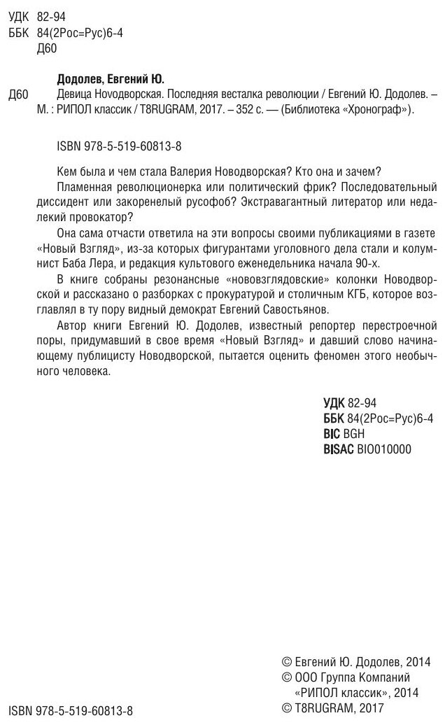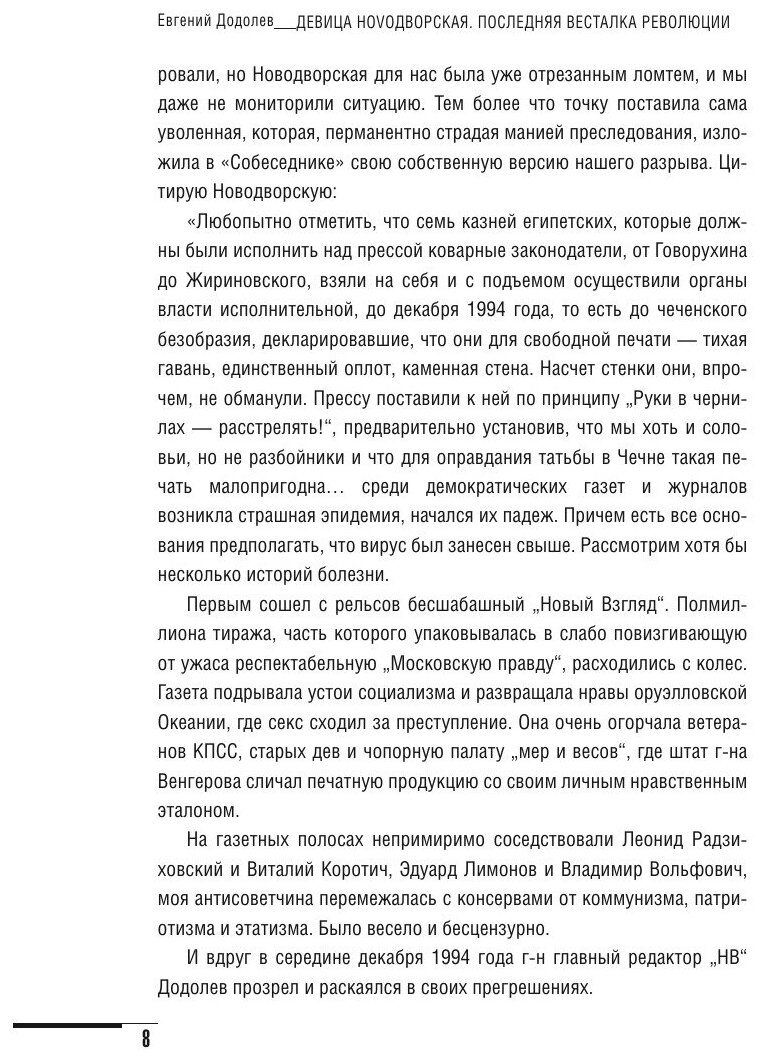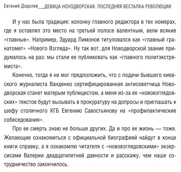 Автор книги Евгений Ю. Додолев, известный репортер перестроечной поры, придумавший в свое время «Новый Взгляд» и давший слово начинающему публицисту Новодворской, пытается оценить феномен этого необычного человека.