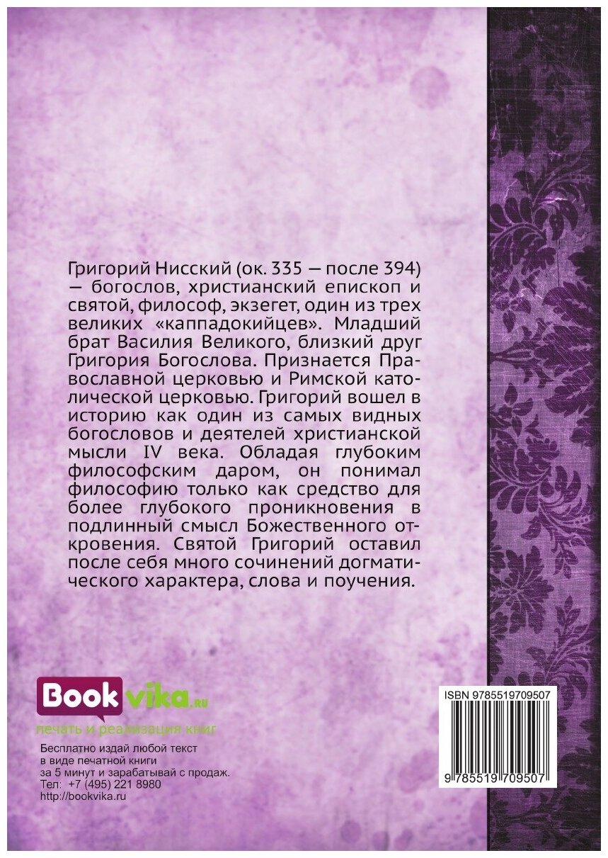 Григорий Нисский (ок. 335 — после 394) — богослов, христианский епископ и святой, философ, экзегет, один из трех великих «каппадокийцев». Младший брат Василия Великого, близкий друг Григория Богослова. Признается Православной церковью и Римской католической церковью. Григорий вошел в историю как один из самых видных богословов и деятелей христианской мысли IV века. Обладая глубоким философским даром, он понимал философию только как средство для более глубокого проникновения в подлинный смысл Божественного откровения. Святой Григорий оставил после себя много сочинений догматического характера, слова и поучения.
