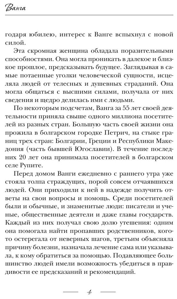 О Ванге написано множество книг. Кто-то считает её колдуньей, кто-то – ангелом во плоти, но трудно отрицать одно: проявленные ею способности – удивительный феномен XX века. Скромная болгарская крестьянка и ясновидящая за свою жизнь