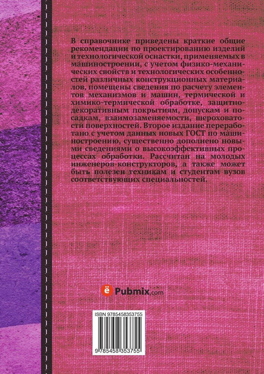 Эта книга - репринт оригинального издания (издательство "Технiка", 1983 год), созданный на основе электронной копии высокого разрешения, которую очистили и обработали вручную, сохранив структуру и орфографию оригинального издания. Редкие, забытые и малоизвестные книги, изданные с петровских времен до наших дней, вновь доступны в виде печатных книг. В справочнике приведены краткие общие рекомендации по проектированию изделий и технологической оснастки, применяемых в машиностроении, с учетом физико-механических свойств и технологических особенностей различных конструкционных материалов, помещены сведения по расчету элементов механизмов и машин, термической и химико-термической обработке, защитно-декоративным покрытиям, допускам и посадкам, взаимозаменяемости, шероховатости поверхностей. Второе издание переработано с учетом данных новых ГОСТ по машиностроению, существенно дополнено новыми сведениями о высокоэффективных процессах обработки. Рассчитан на молодых инженеров-конструкторов, а также может быть полезен техникам и студентам вузов соответствующих специальностей.