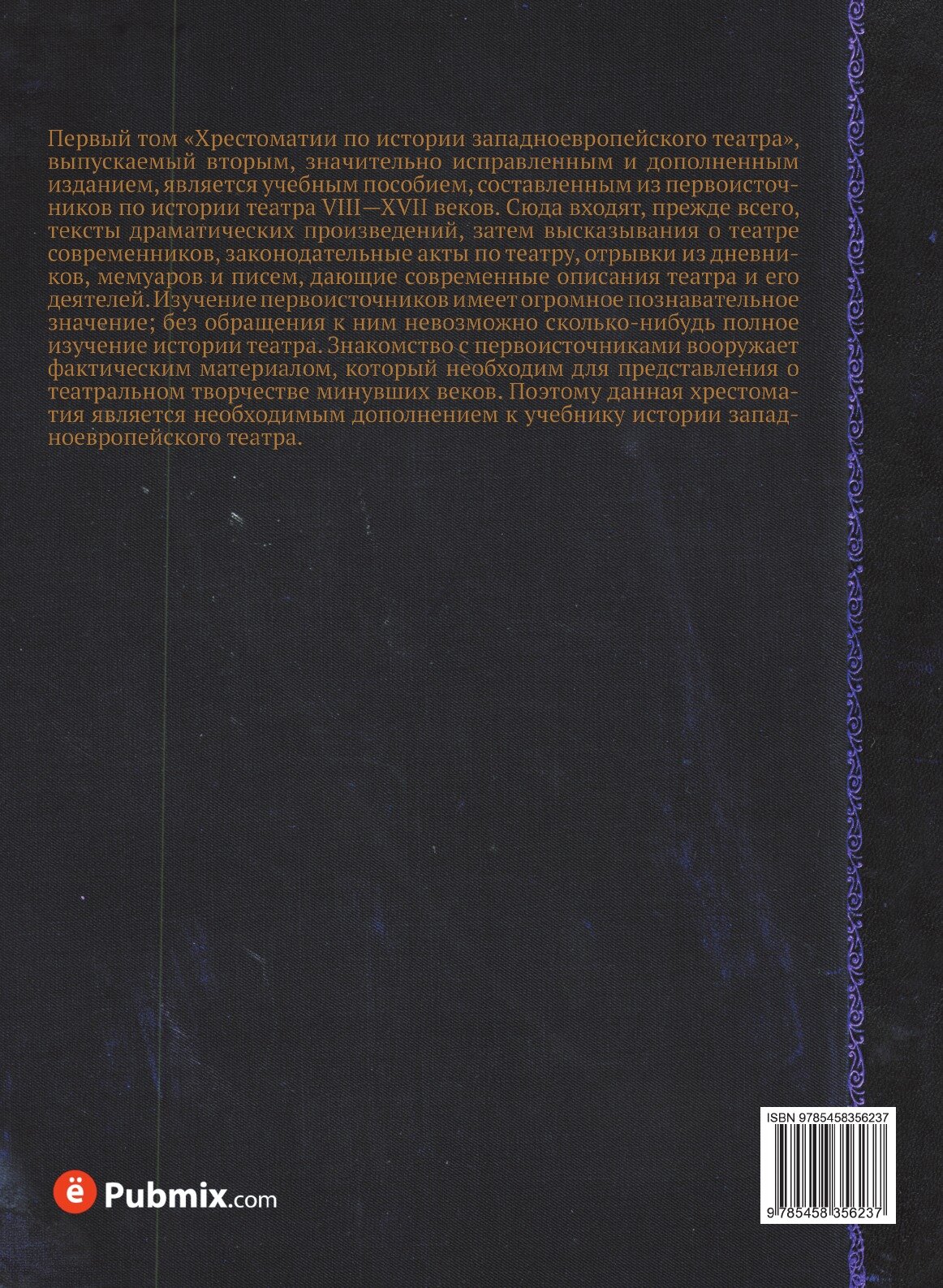 Первый том «Хрестоматии по истории западноевропейского театра», выпускаемый вторым, значительно исправленным и дополненным изданием, является учебным пособием, составленным из первоисточников по истории театра VIII—XVII веков. Сюда входят, прежде всего, тексты драматических произведений, затем высказывания о театре современников, законодательные акты по театру, отрывки из дневников, мемуаров и писем, дающие современные описания театра и его деятелей. Изучение первоисточников имеет огромное познавательное значение; без обращения к ним невозможно сколько-нибудь полное изучение истории театра. Знакомство с первоисточниками вооружает фактическим материалом, который необходим для представления о театральном творчестве минувших веков. Поэтому данная хрестоматия является необходимым дополнением к учебнику истории западноевропейского театра.