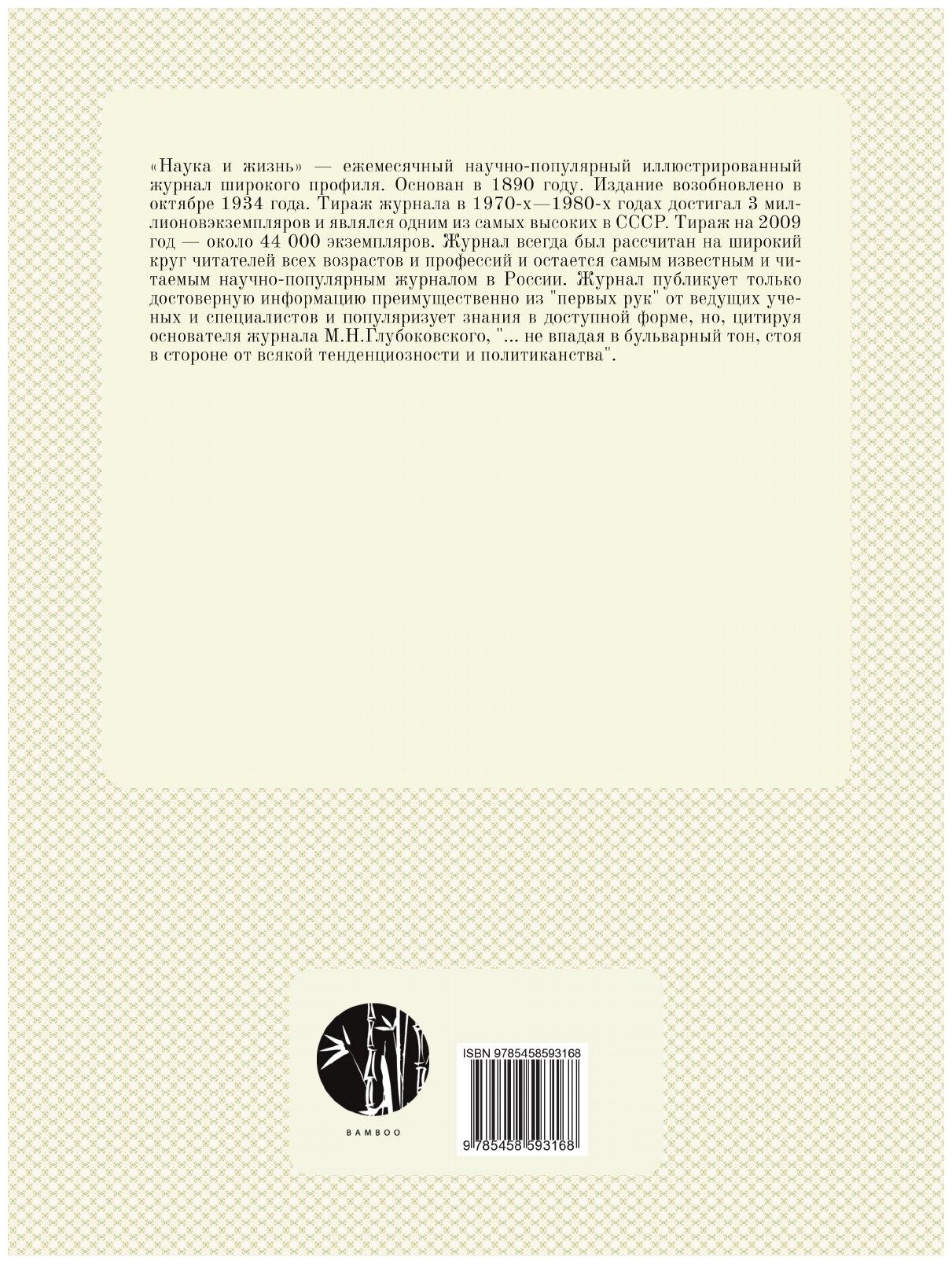 «Наука и жизнь» — ежемесячный научно-популярный иллюстрированный журнал широкого профиля. Основан в 1890 году. Издание возобновлено в октябре 1934 года. Тираж журнала в 1970-х—1980-х годах достигал 3 миллионовэкземпляров и являлся одним из самых высоких в СССР. Тираж на 2009 год — около 44 000 экземпляров. Журнал всегда был рассчитан на широкий круг читателей всех возрастов и профессий и остается самым известным и читаемым научно-популярным журналом в России. Журнал публикует только достоверную информацию преимущественно из "первых рук" от ведущих ученых и специалистов и популяризует знания в доступной форме, но, цитируя основателя журнала М.Н.Глубоковского, "... не впадая в бульварный тон, стоя в стороне от всякой тенденциозности и политиканства".