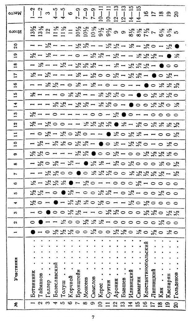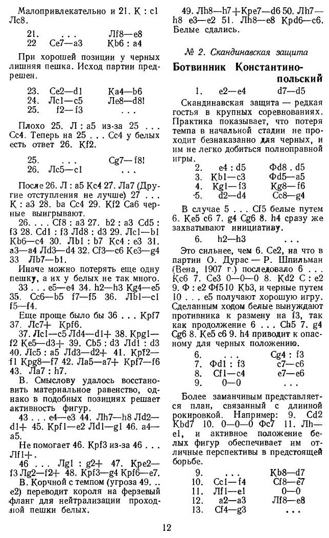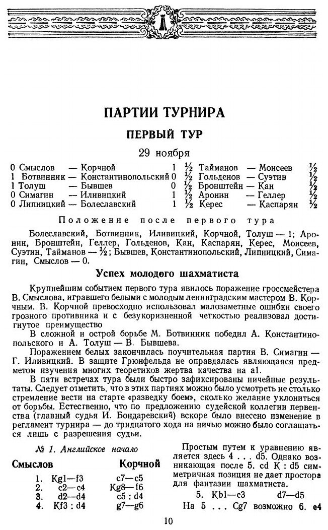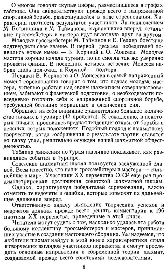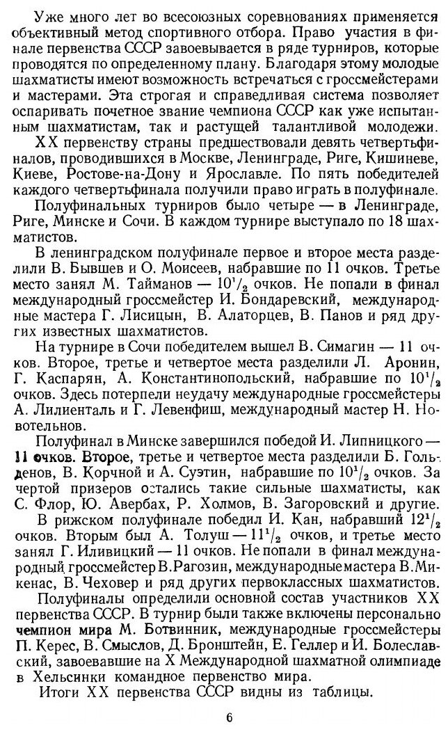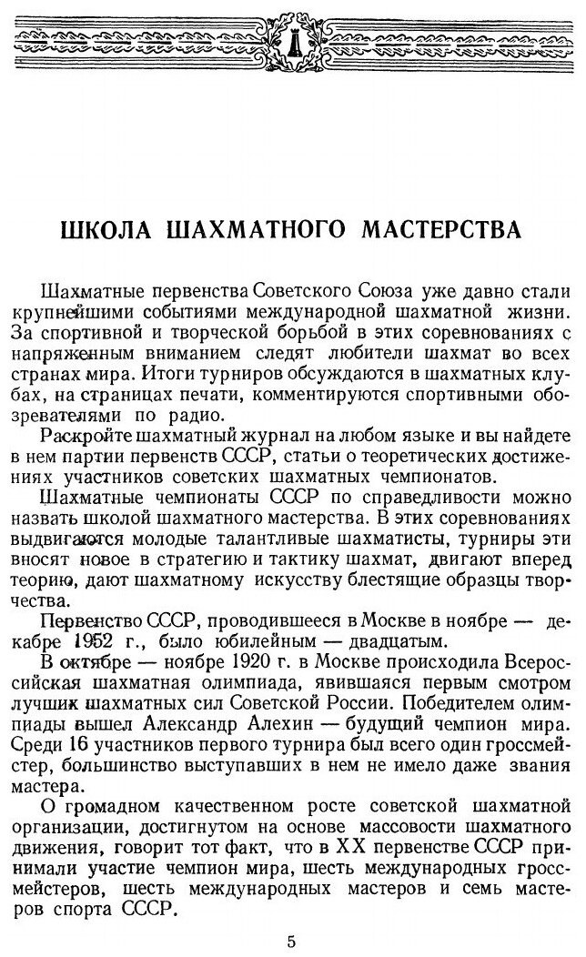 Первенство СССР, проводившееся в Москве в ноябре-декабре 1952 г., было юбилейным - двадцатым.В турнир персонально были включены чемпион мира М.Ботвинник, международные гроссмейстеры П.Керес, В.Смыслов, Д.Бронштейн, Е.Геллер и И.Болеславский, завоевавшие на Х Международной шахматной олимпиаде в Хельсинки командное первенство мира. К ним присоединились победители полуфиналов: гроссмейстер М.Тайманов, мастера Л.Аронин, В.Бывшев, Б.Гольденов, Г.Иливицкий, И.Кан, Г.Каспарян, А.Константинопольский, В.Корчной, И.Липницкий, О.Моисеев, В.Симагин, А.Суэтин и А.Толуш.Перед последним туром лидировал молодой гроссмейстер М.Тайманов - 13,5 очка, у М.Ботвинника - 12,5, у Е.Геллера и И.Болеславского - 11. Проигрыш в последнем туре Тайманова Геллеру позволил Ботвиннику догнать лидера, а Геллеру занять чистое третье место. В матче из 6 партий за первое место, состоявшемся в феврале 1953 г., в упорной борьбе со счетом 3,5:2,5 победил многократный чемпион страны М.Ботвинник.Книга содержит все 190 партий турнира (большинство партий с примечаниями) и 6 партий дополнительного матча Ботвинник-Тайманов. В книге также предисловие составителя и статья Л. Абрамова и И. Бондаревского "Дебюты ХХ первенства СССР".