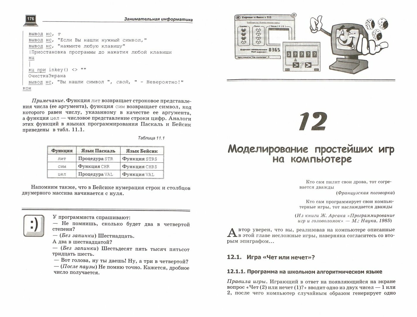Книга во многом аналогична популярным книгам "Занимательная физика" Я. И. Перельмана, "Математические чудеса и тайны" М. Гарднера, "В царстве смекалки" Е. И. Игнатьева, "Математическая смекалка" Б. А. Кордемского и др. Она содержит большое количество разнообразных занимательных логических задач и головоломок, интересных фактов и полезных программ, простейших компьютерных игр, фокусов и др. Материалы книги охватывают широкий круг вопросов информатики, вычислительной техники и информационных и коммуникационных технологий (системы счисления, кодирование информации, логика, основы программирования, Интернет и др.). Эти материалы можно использовать как в учебном процессе, так и для внеклассной работы с учащимися. Для всех, кто интересуется информатикой. 5-е издание.