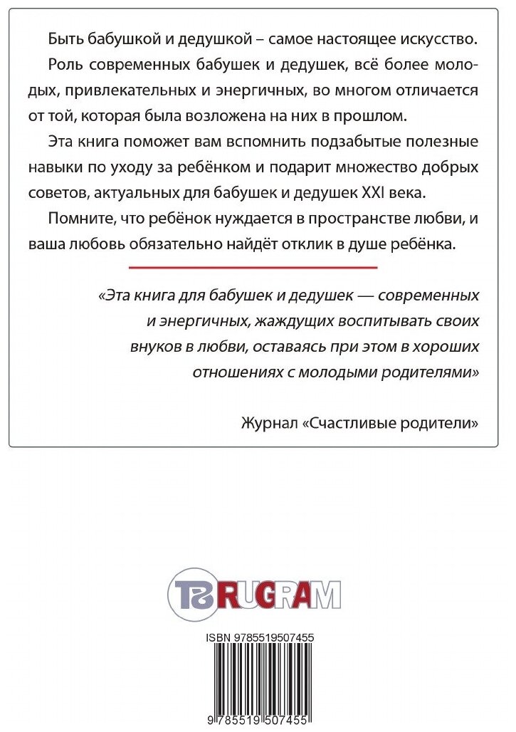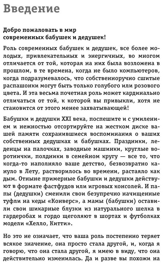1Быть бабушкой и дедушкой самое настоящее искусство, при этом роль современных бабушек и дедушек, всё более молодых, привлекательных и энергичных, во многом отличается от той, которая была возложена на них в прошлом. Наша книга поможет вам вспомнить подзабытые полезные навыки по уходу за ребёнком и подарит множество добрых советов, актуальных для бабушек и дедушек XXI века. Помните, что ребёнок нуждается в пространстве любви, и ваша любовь обязательно найдёт отклик в душе ребёнка. Добро пожаловать в мир, наполненный радостью, и пусть вас не пугают первые шаги, которые необходимо сделать на этом пути. Ведь только от вас зависит, кем вы станете для своих внуков и будете ли вы счастливы в своей новой восхитительной роли.
