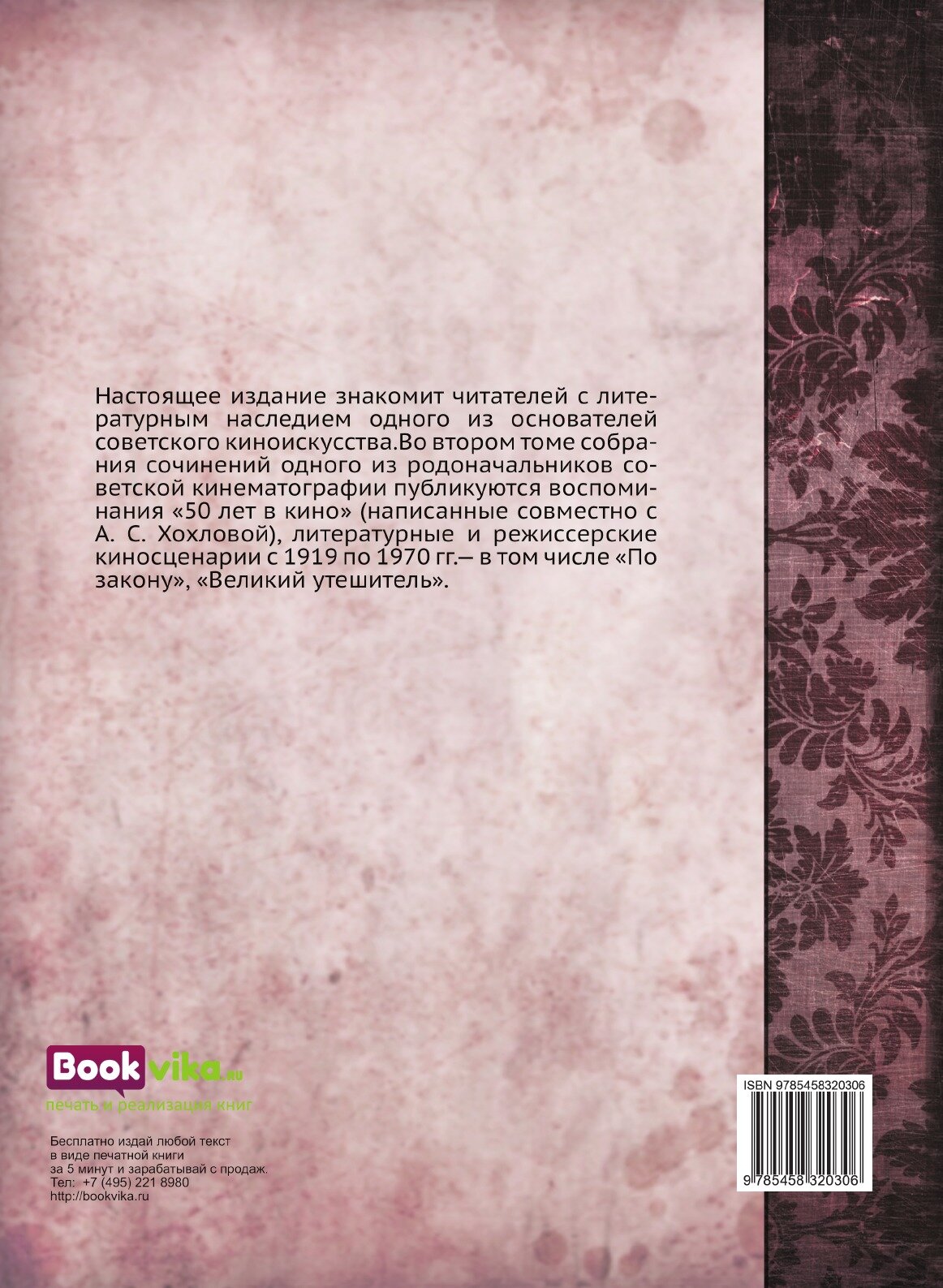 Настоящее издание знакомит читателей с литературным наследием одного из основателей советского киноискусства.Во втором томе собрания сочинений одного из родоначальников советской кинематографии публикуются воспоминания «50 лет в кино» (написанные совместно с А. С. Хохловой), литературные и режиссерские киносценарии с 1919 по 1970 гг.— в том числе «По закону», «Великий утешитель».