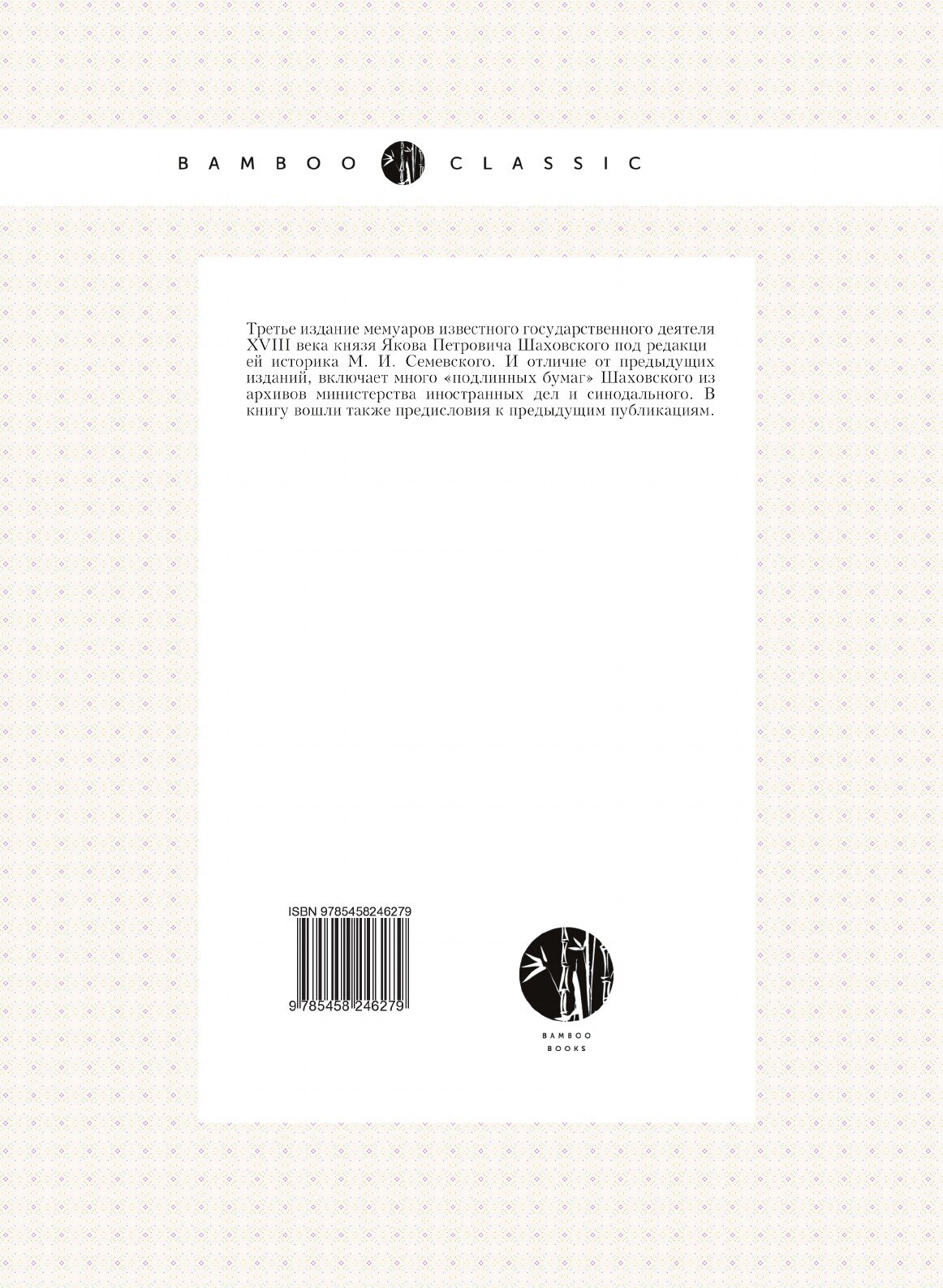 Эта книга — репринт оригинального издания (издательство "Русская старина", 1872 год), созданный на основе электронной копии высокого разрешения, которую очистили и обработали вручную, сохранив структуру и орфографию оригинального издания. Редкие, забытые и малоизвестные книги, изданные с петровских времен до наших дней, вновь доступны в виде печатных книг.Третье издание мемуаров известного государственного деятеля XVIII века князя Якова Петровича Шаховского под редакцией историка М. И. Семевского. И отличие от предыдущих изданий, включает много «подлинных бумаг» Шаховского из архивов министерства иностранных дел и синодального. В книгу вошли также предисловия к предыдущим публикациям.
