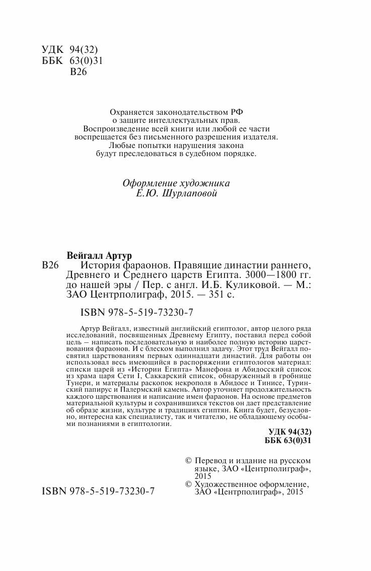 Артур Вейгалл, известный английский египтолог, автор целого ряда исследований, посвященных Древнему Египту, поставил перед собой цель – написать последовательную и наиболее полную историю царствования фараонов. И с блеском выполнил задачу. Этот труд Вейгалл посвятил царствованиям первых одиннадцати династий. Для работы он использовал весь имеющийся в распоряжении египтологов материал: списки царей из «Истории Египта» Манефона и Абидосский список из храма царя Сети I, Саккарский список, обнаруженный в гробнице Тунери, и материалы раскопок некрополя в Абидосе и Тинисе, Туринский папирус и Палермский камень. Автор уточняет продолжительность каждого царствования и написание имен фараонов. На основе предметов материальной культуры и сохранившихся текстов он дает представление об образе жизни, культуре и традициях египтян. Книга будет, безусловно, интересна как специалисту, так и читателю, не обладающему особыми познаниями в египтологии.