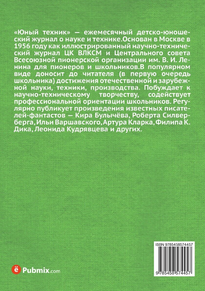 «Юный техник» — ежемесячный детско-юношеский журнал о науке и технике.Основан в Москве в 1956 году как иллюстрированный научно-технический журнал ЦК ВЛКСМ и Центрального совета Всесоюзной пионерской организации им. В. И. Ленина для пионеров и школьников.В популярном виде доносит до читателя (в первую очередь школьника) достижения отечественной и зарубежной науки, техники, производства. Побуждает к научно-техническому творчеству, содействует профессиональной ориентации школьников. Регулярно публикует произведения известных писателей-фантастов — Кира Булычёва, Роберта Силверберга, Ильи Варшавского, Артура Кларка, Филипа К. Дика, Леонида Кудрявцева и других.