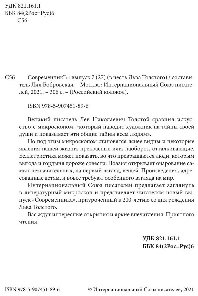 Великий писатель Лев Николаевич Толстой сравнил искусство с микроскопом, «который наводит художник на тайны своей души и показывает эти общие тайны всем людям». Но под этим микроскопом становятся яснее видны и некоторые явления нашей жизни, прекрасные или, наоборот, отталкивающие. Беллетристика может показать, во что превращаются люди, которым выгода и гордыня дороже совести. Поэзия открывает очарование самых незначительных, на первый взгляд, вещей. Произведения, адресованные детям, и вовсе требуют особенного взгляда на мир. Интернациональный Союз писателей предлагает заглянуть в литературный микроскоп и представляет читателям новый выпуск «Современника», приуроченный к 200-летию со дня рождения Льва Толстого. Вас ждут интересные открытия и яркие впечатления. Приятного чтения!