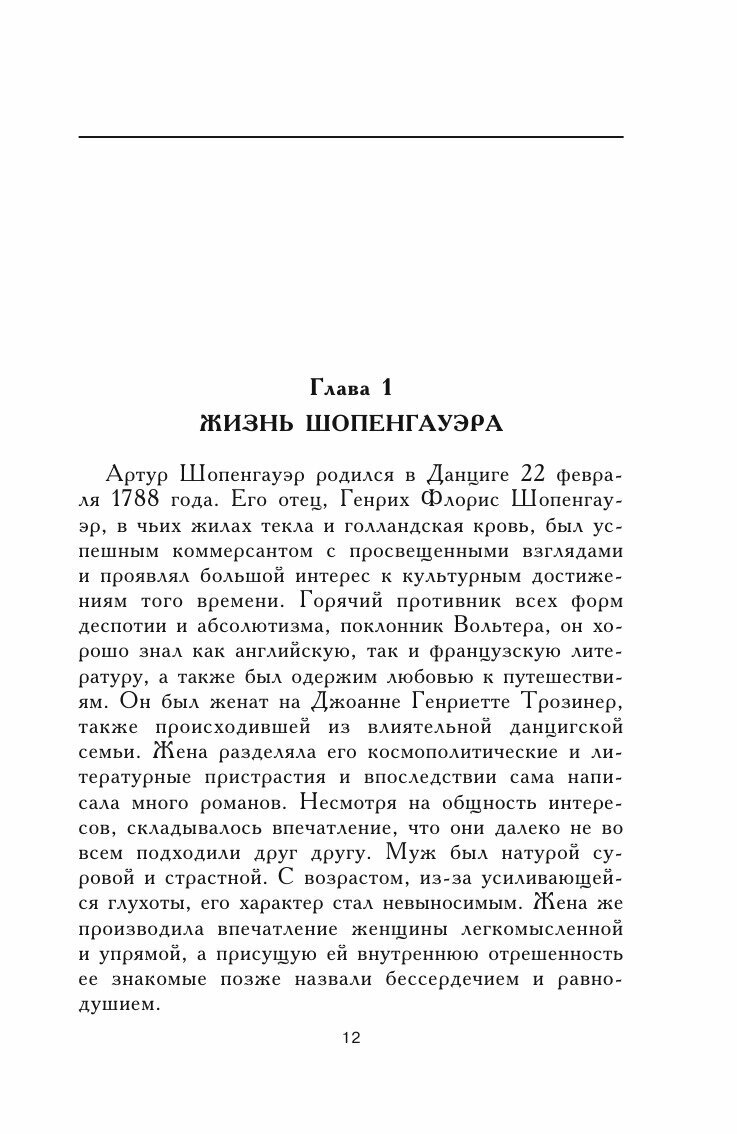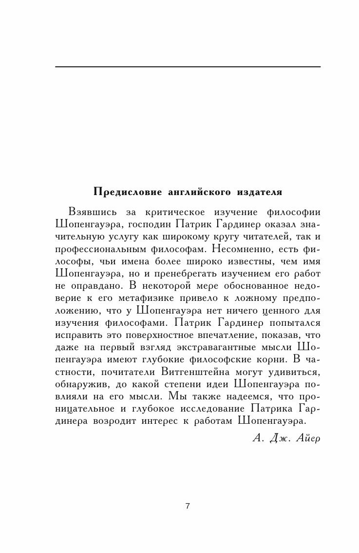 В своем исследовании британский философ Патрик Гардинер определяет и оценивает основные идеи философии Артура Шопенгауэра, объясняет их значение и место в истории мысли. Автор доказывает, что экстравагантные, на первый взгляд, фундаментальные идеи немецкого мыслителя в немалой мере повлияли на учения Л.Витгенштейна, Ф.Ницше, Э.Гартмана, З.Фрейда. В книге анализируется оригинальная шопенгауэровская система, на которую наибольшее влияние оказали Платон и И.Кант и которая по праву заняла свое место в истории мировой философской мысли.