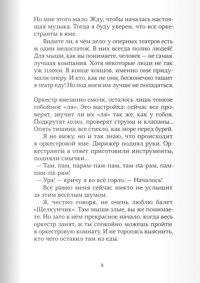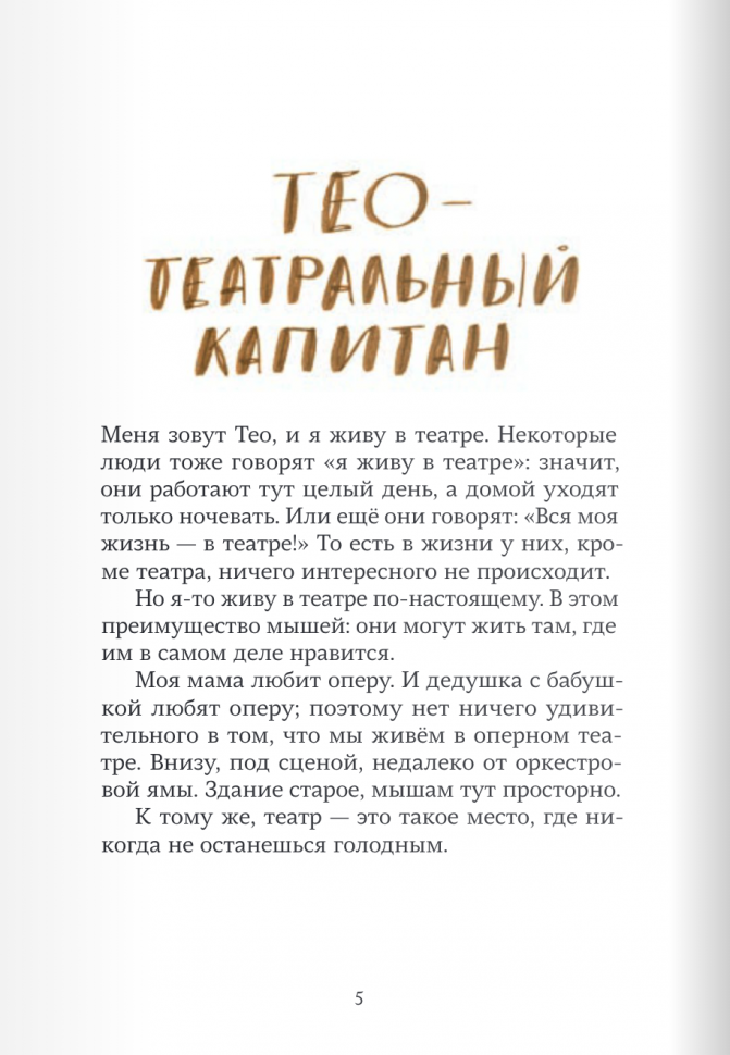 Тео и вся его семья - театральные мыши. Они поселились в театре давным-давно, поэтому хорошо знают театр изнутри: оркестровая, костюмерная, балетная. Но большую часть времени Тео проводит на чердаке - там уютно мечтать о далёком настоящем море. И надо же такому случиться, что оркестр собирается на гастроли именно туда! Первое издание "Тео - театральный капитан" было включено в международный каталог лучших книг для детей "Белые вороны" в 2018 году.
