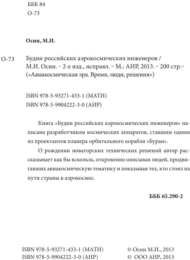 Книга «Будни российских аэрокосмических инженеров» написана разработчиком космических аппаратов, ставшим одним из проектантов планера орбитального корабля «Буран».