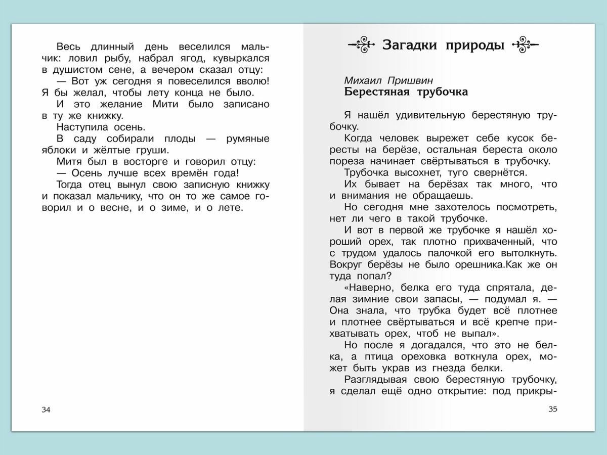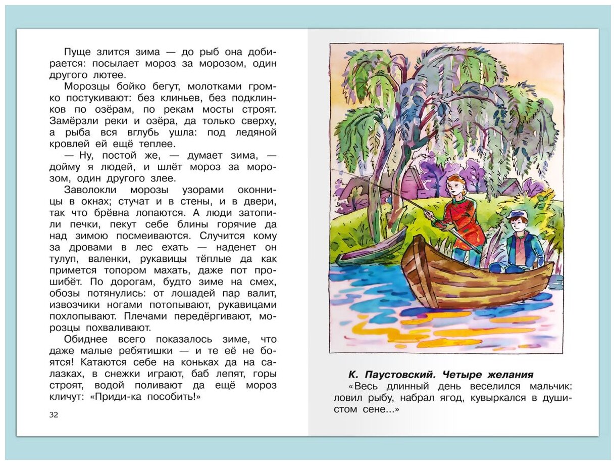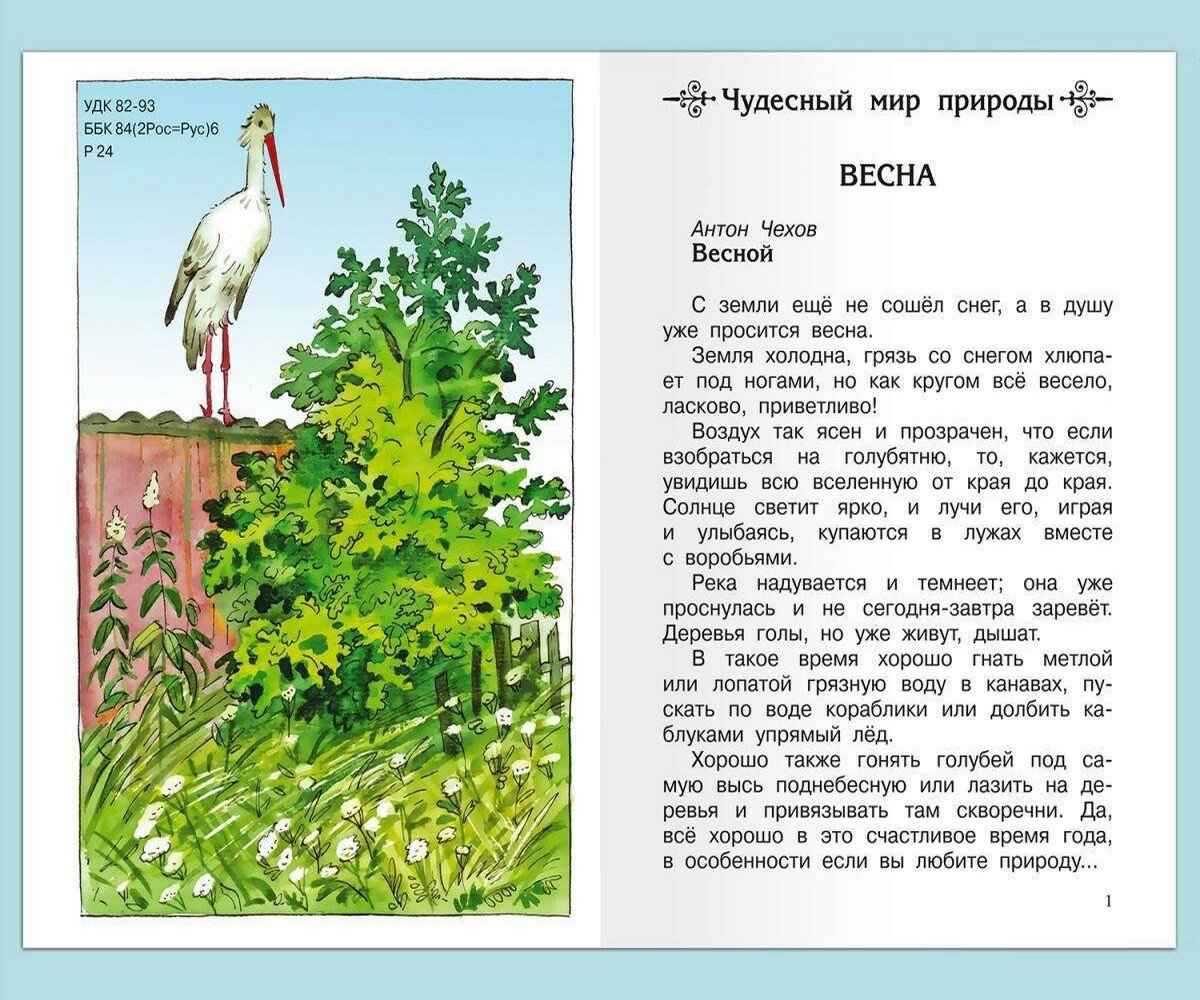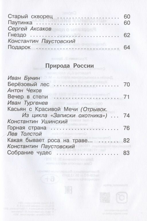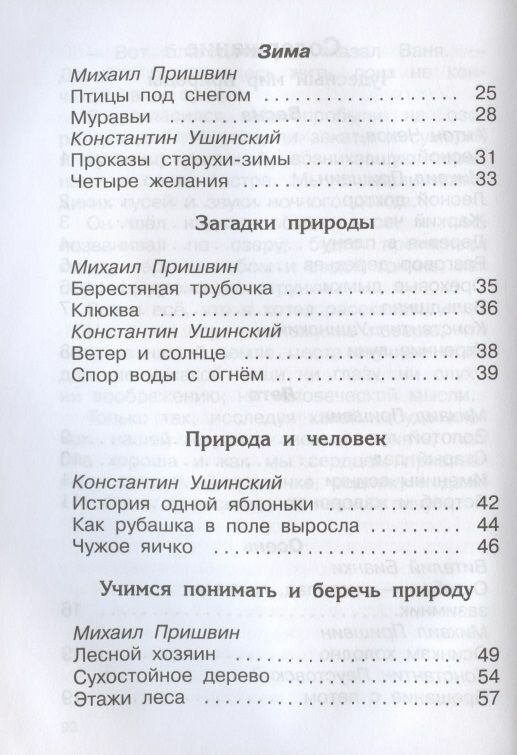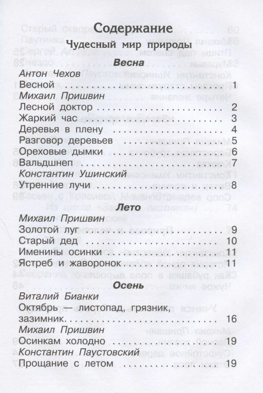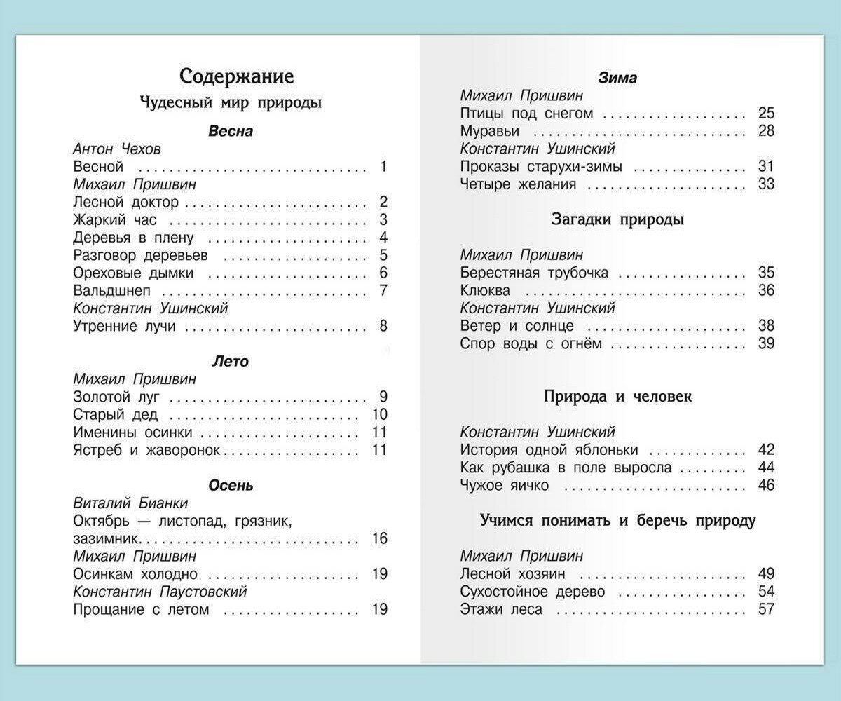 В сборник вошли произведения русских писателей о красоте нашей родной природы и жизни зверей и птиц. Эти произведения помогут юным читателям увидеть разнообразие окружающего мира, научат бережно относиться к природе и заботиться о ней. Тексты произведений представлены без сокращений, напечатаны на хорошей бумаге крупным шрифтом и содержат цветные иллюстрации З. Яриной. Издание среднего формата станет отличным дополнением домашней или школьной библиотеки и не займёт много места в рюкзаке школьника. В сборник вошли следующие произведения: Весна Антон Чехов Весной Михаил Пришвин Лесной доктор Жаркий час Деревья в плену Разговор деревьев Ореховые дымки Вальдшнеп Константин Ушинский Утренние лучи Лето Михаил Пришвин Золотой луг Старый дед Именины осинки Ястреб и жаворонок Осень Виталий Бианки Октябрь — листопад, грязник, зазимник Михаил Пришвин Осинкам холодно Константин Паустовский Прощание с летом Зима Михаил Пришвин Птицы под снегом Муравьи Константин Ушинский Проказы старухи-зимы Четыре желания Загадки природы Михаил Пришвин Берестяная трубочка Клюква Константин Ушинский Ветер и солнце Спор воды с огнём Природа и человек Константин Ушинский История одной яблоньки Как рубашка в поле выросла Чужое яичко Учимся понимать и беречь природу Михаил Пришвин Лесной хозяин Сухостойное дерево Этажи леса Старый скворец Паутинка Сергей Аксаков Гнездо Константин Паустовский Подарок Природа России Иван Бунин Берёзовый лес Антон Чехов Вечер в степи Иван Тургенев Касьян с Красивой Мечи (Отрывок. Из цикла «Записки охотника») Константин Ушинский Горная страна Лев Толстой Какая бывает роса на траве… Константин Паустовский Собрание чудес