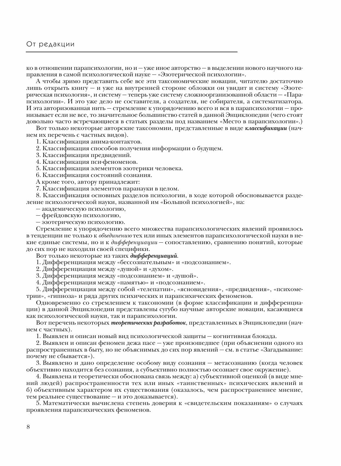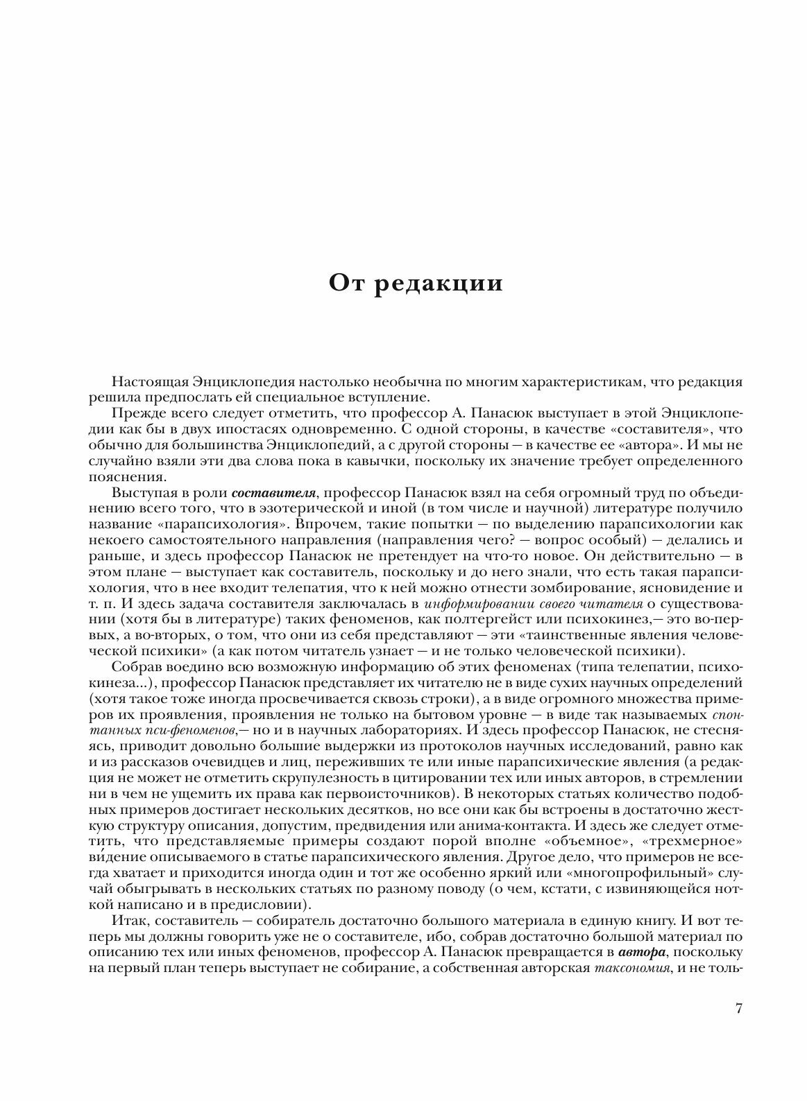 В самой полной среди известных российскому читателю отечественных и переводных книг - в Энциклопедии парапсихологии - доктор психологических наук, профессор А.Панасюк представляет описание парапсихических явлений типа телепатии, реинкарнации, предвидения и др. с позиции академической психологии и дает ответы на вопросы о степени достоверности подобных явлений, о степени доверия приводимым в книге многочисленных рассказам и опытам, делится своими идеями об объяснении существования этих явлений, о проведении оригинальных экспериментов, об определении самим читателем своих способностей к экстрасенсорному восприятию информации. Главное достоинство книги - стремление автора к объективизации при описании множества пси-феноменов. "Что доказано - то доказано" - таково кредо автора этой нестандартно написанной, но все же вполне репрезентативной Энциклопедии, из которой читатель получит также информацию о зомбировании, гипнозе, подсознании, пси-оружии, трансе, карме, целительстве и т. п. Адресована всем, кого интересует не только академическая, но и альтернативная психология, а также членам комиссии по борьбе с лженаукой при Российской академии наук.