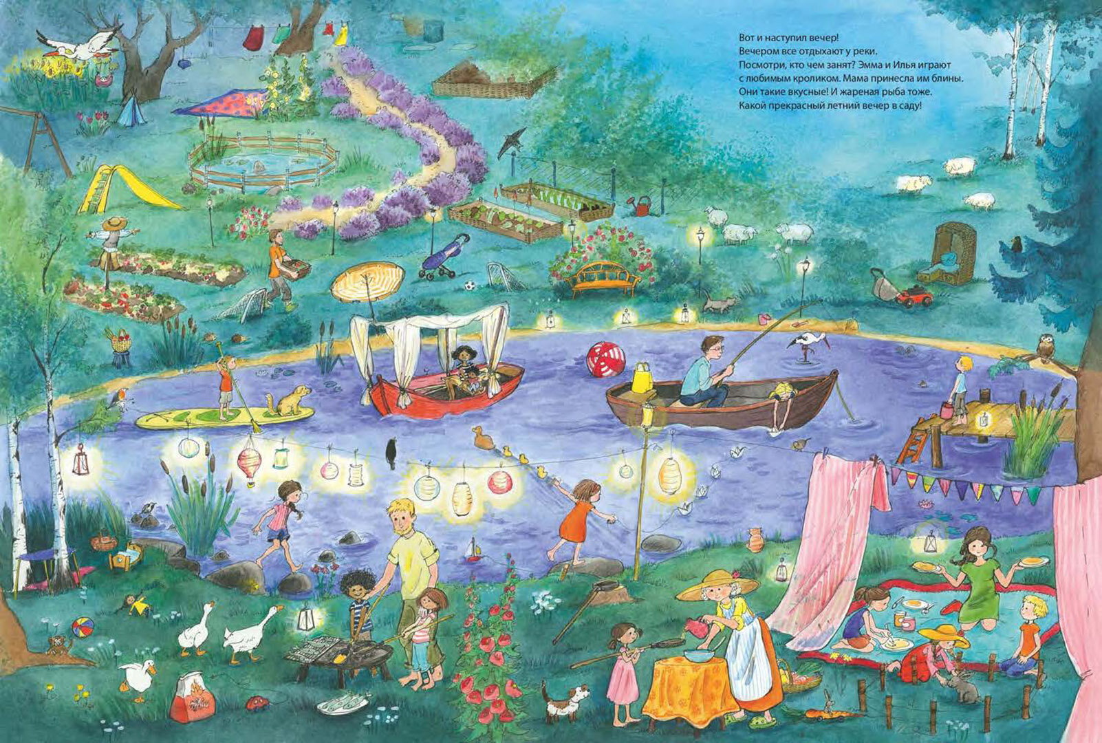 Сегодня маленькая Эмма и ее братик Илья приехали погостить к своей бабушке. У нее так интересно и весело! Можно погулять в саду, покормить кроликов, помочь бабушке в огороде и поиграть в домике на дереве. Только вот один из бабушкиных любимцев, маленький серенький кролик куда-то спрятался. Помоги малышам его найти. А заодно рассмотри внимательно: что интересного в бабушкином саду, чем заняты дети и другие гости. Виммельбух большого формата, напечатан на плотном картоне.