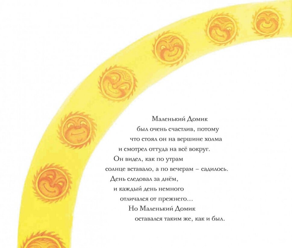 О чем эта книгаО судьбе Маленького Домика, который и является главным героем книги. Однажды его построили, и был произнесен завет: этот домик будет стоять долго-долго и в нем будут жить правнуки наших правнуков.Домик встречает лето и зиму, утро и ночь, радуется распустившимся цветам яблони и первым снежинкам, он наблюдает жизнь людей, которые в нем живут. Но со временем на тихую деревенскую жизнь начинает наступать город. Он все ближе и ближе, и вот уже Маленький Домик оказывается в самом его центре, окруженный небоскребами, ревущими электричками, грохочущими трамваями и спешащими людьми. Хозяева его давно покинули.Трагедия заключается в том, что сумасшедший ритм города никак не может быть принят Домиком. Та ритмическая жизнь, согласная с природой уже не доступна ему. И хозяева его давно бросили. Домик обветшал. Дальше случается невероятное. И в конце истории Домик переезжает на столь милую ему поляну с ромашками и яблонями, и возвращается к своему естественному ритму жизни.ИллюстрацииНарисовала всю книгу от начала до конца ее автор - Вирджиния Ли Бертон. Удивительный мастер. Мягкие, теплые тона, смена времен года и времени суток. Цикличность, прородосообразность. Резкая смена картин индустриального города.Уникальный художественный прием придумала Ли Бертон: ее Маленький Домик практически на всех 48 страницах находится в центре иллюстрации на одном и том же месте. И только мир вокруг него меняется.