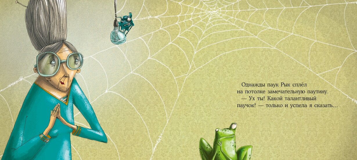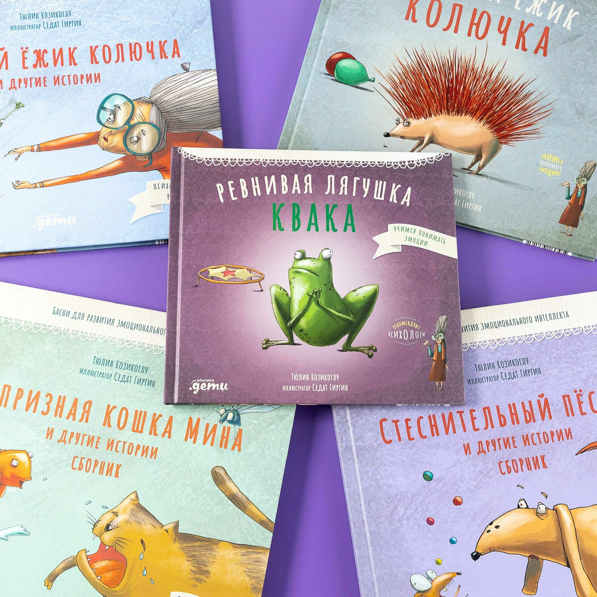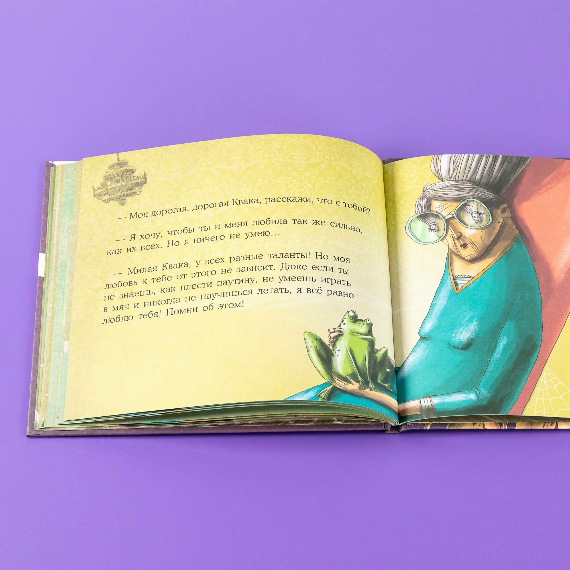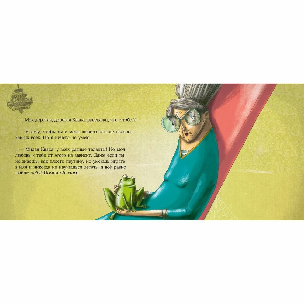 В доме бабушки Лейлы собрались девять животных с непростыми характерами: кто-то ленится, кто-то капризничает, кто-то стесняется.Лягушка Квака очень ревнивая: ей кажется, что бабушка любит других зверушек больше, чем её. Квака хочет подражать своим соседям (например, пытается плести паутину или взлетать), но у неё не получается. Лягушка очень грустит, пока не понимает, что не нужно быть на кого-то похожей, чтобы тебя любили.На своем примере Квака объяснит вашему ребёнку, что:· ревность и зависть — вредные и грустные чувства;· у каждого человека — свой талант;· любят не за таланты, а просто так.