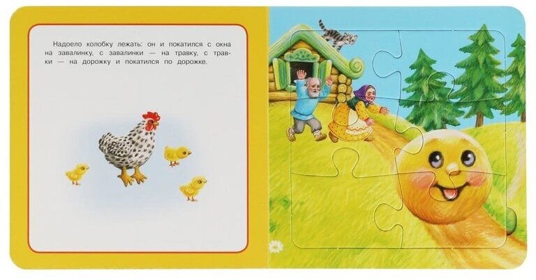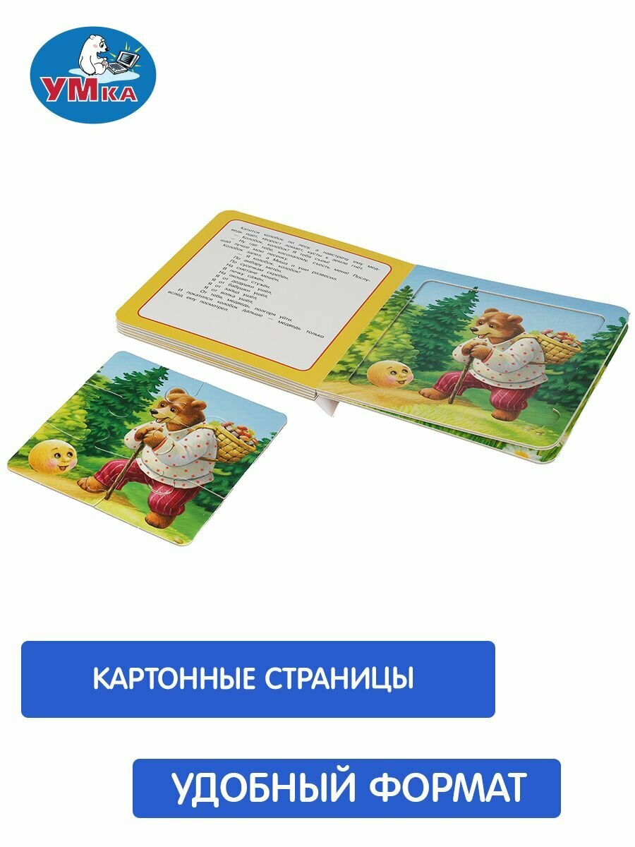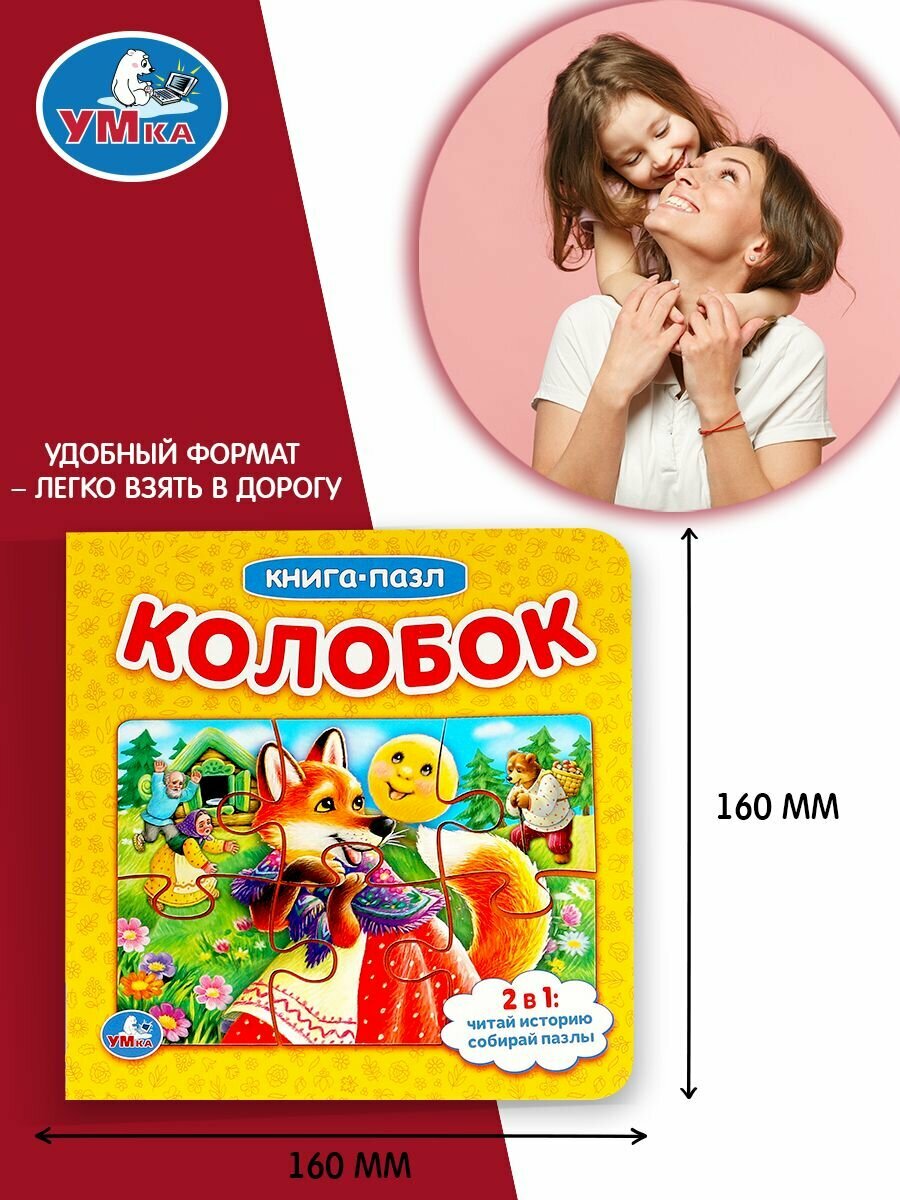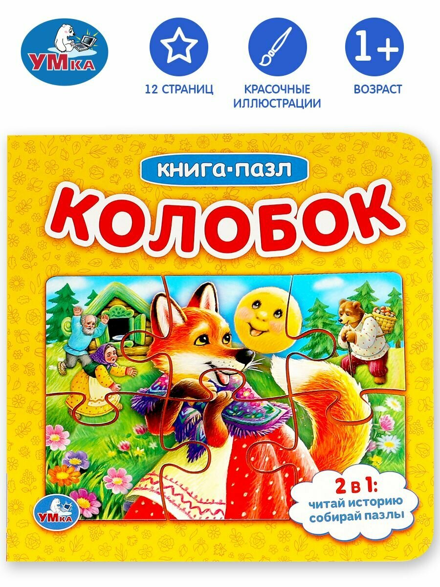Книга-пазл 2 в 1 "Колобок" ТМ "УМка" станет прекрасным подарком для ребёнка: известная сказка - 6 пазлов из 6 деталей. Данная книга выполняет сразу 2 функции: это и книга для чтения, и игра в пазлы. На каждом развороте малыша ждёт интересное повествование, а также яркий пазл с изображение персонажей сказки. Книжка изготовлена из плотного картона, поэтому мамы могут не опасаться, что ребёнок порвёт странички. Благодаря удобному формату книгу можно взять с собой в дорогу.
