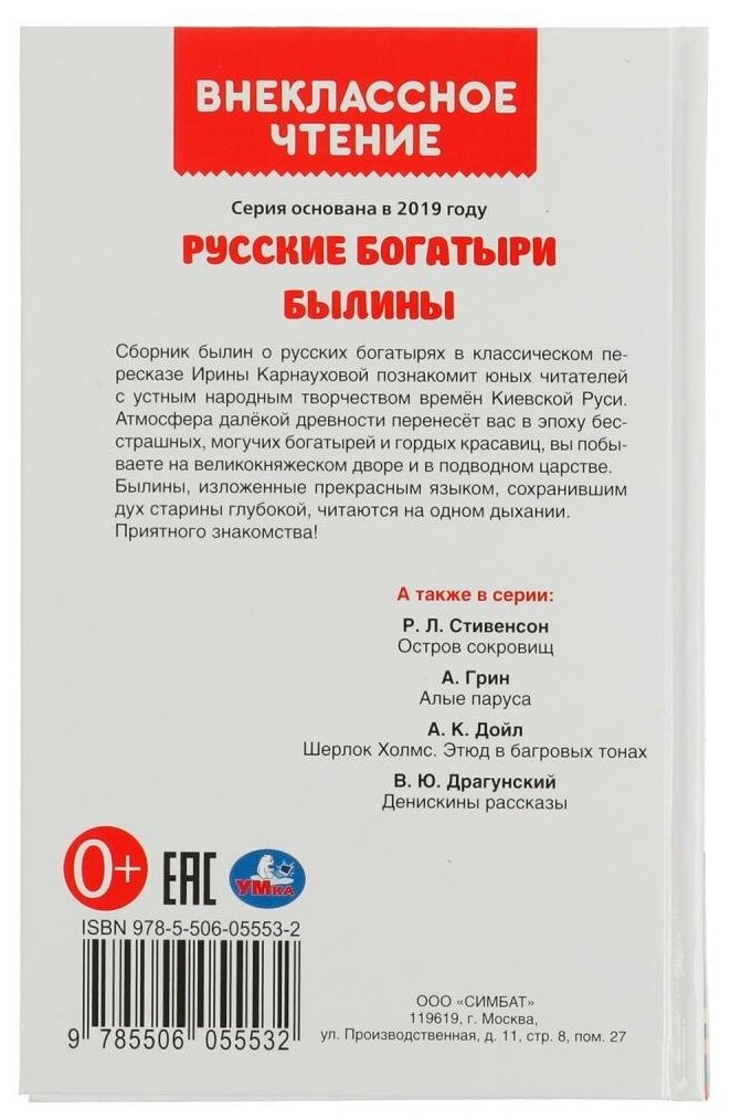 Книга «Русские богатыри. Былины» из серии «Внеклассное чтение» ТМ «УМка» - отличный вариант для самостоятельного чтения вне занятий в школе:- яркие крупные картинки- крупный шрифт- твёрдый переплёт- удобный формат- соответствует ФГОССборник былин о русских богатырях в классическом пересказе Ирины Карнауховой познакомит юных читателей с устным народным творчеством времён Киевской Руси. Атмосфера далёкой древности перенесёт ребёнка в эпоху бесстрашных, могучих богатырей и гордых красавиц, он побывает на великокняжеском дворе и в подводном царстве. Былины, изложенные прекрасным языком, сохранившим дух старины, читаются на одном дыхании. Благодаря компактному размеру книгу удобно брать с собой в дорогу.Чтение книг из серии «Внеклассное чтение» ТМ «УМка» расширяет кругозор и развивает:- образное мышление- визуальное восприятие- внимание- память- речьОбъём: 208 + 16 стр. Формат: 125 х 195 мм (А5).Материал: офсетная бумага.Рекомендовано детям младшего школьного возраста.