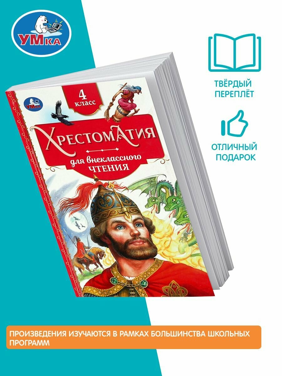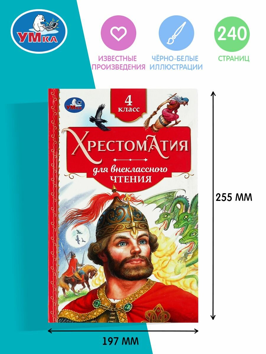 Хрестоматия для внеклассного чтения в 4 классе ТМ УМка - отличный вариант для самостоятельного чтения вне занятий в школе:- былины в пересказе И. В. Карнауховой,- литературные сказки: А. С. Пушкин "Сказка о мёртвой царевне и семи богатырях",- русская проза: П. П. Бажов "Серебряное копытце", "Медной горы Хозяйка"; Е. Л. Шварц "Сказка о потерянном времени"; М. М. Зощенко "Ёлка"; А. И. Куприн "Белый пудель",- русская поэзия: М. Ю. Лермонтов, А. Н. Плещеев, И. А. Бунин, В. Я. Брюсов, С. А. Есенин, М. И. Цветаева,- произведения напечатаны без сокращений,- интересные картинки,- крупный шрифт,- твёрдый переплёт,- удобный формат.В книгу вошли произведения русские былины, рассказы и лучшие стихи русских классиков, которые изучают в четвёртом классе в рамках большинства школьных программ. Они помогут сформировать у ребёнка интерес к чтению, расширят кругозор юного читателя и помогут самостоятельно подготовиться к урокам. Чтение хрестоматии ТМ УМка развивает:- образное мышление,- визуальное восприятие,- внимание,- память,- речь.Объём: 240 стр. Формат: 126 х 200 мм (А5). Материал: офсетная бумага. Рекомендовано детям младшего школьного возраста.