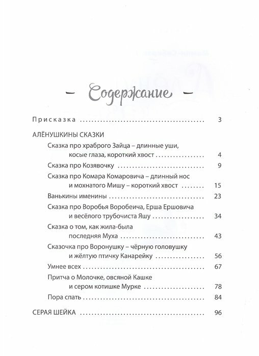 В сборник включены самые известные произведения Д.Н.Мамина-Сибиряка, написанные им для детей: "Алёнушкины сказки" и "Серая шейка". …Каких только сказок не знает Алёнушкин папа! И про Комара Комаровича, и про Воробья Воробеича, и про храброго Зайца, и про многих других сказочных зверей. Целая котомка интересных волшебных историй припасена у него для дочки! И всякий раз, когда засыпает Алёнушка, папа рассказывает ей одну из своих драгоценных сказок... По мотивам сказок Д.Н.Мамина-Сибиряка создано немало мультфильмов, пьес и радиопостановок. Они входят в школьную программу обязательного чтения. Книга украшена волшебными иллюстрациями Галины Егоренковой. СОДЕРЖАНИЕ: П р и с к а з к а АЛЁНУШКИНЫ СКАЗКИ Сказка про храброго Зайца – длинные уши, косые глаза, короткий хвост Сказка про Козявочку Сказка про Комара Комаровича – длинный нос и мохнатого Мишу – короткий хвост Ванькины именины Сказка про Воробья Воробеича, Ерша Ершовича и весёлого трубочиста Яшу Сказка о том, как жила-была последняя Муха Сказочка про Воронушку – чёрную головушку и жёлтую птичку Канарейку Умнее всех Притча о Молочке, овсяной Кашке и сером котишке Мурке Пора спать СЕРАЯ ШЕЙКА