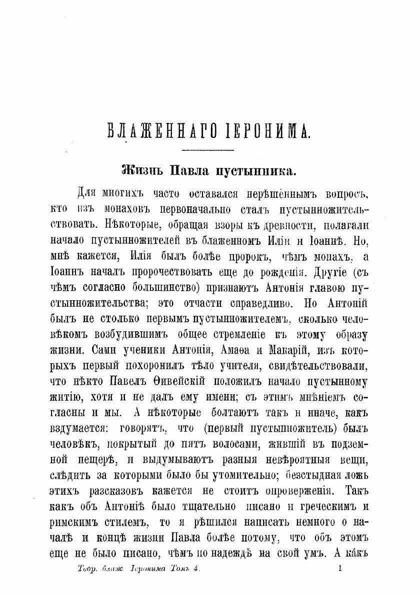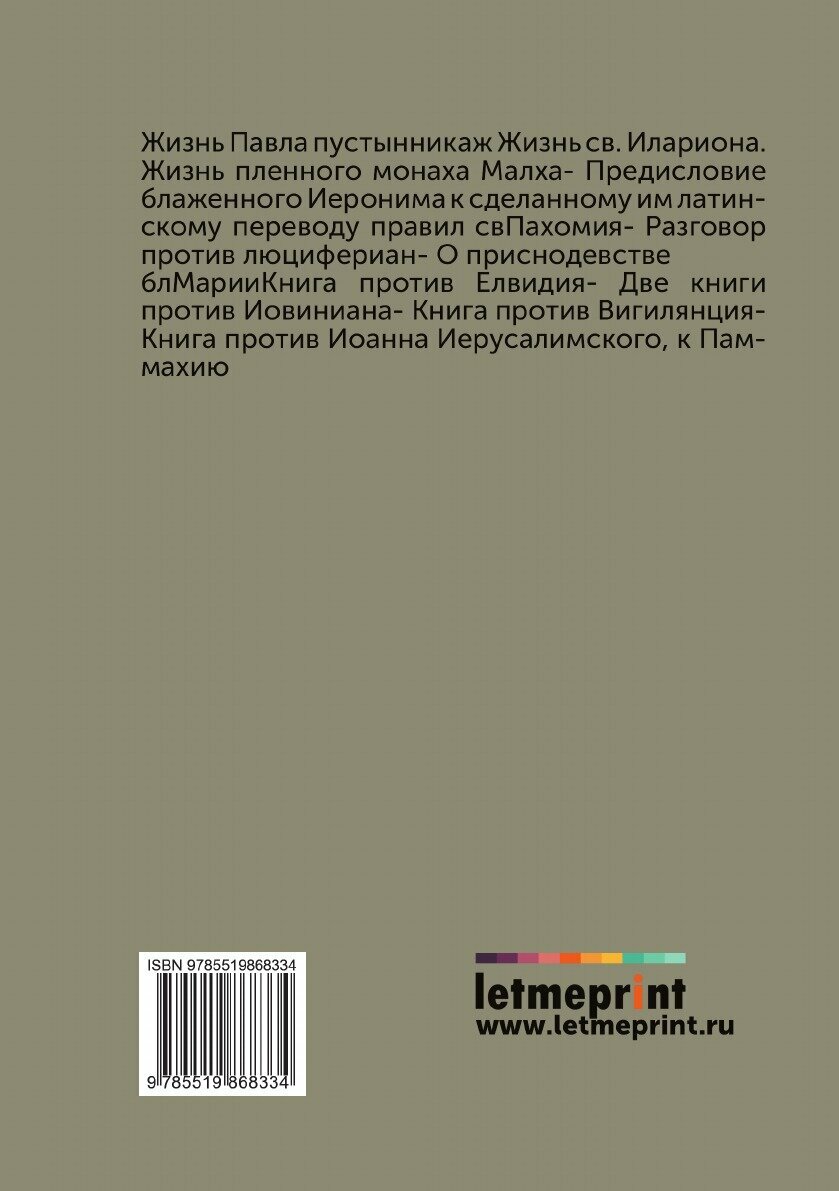 Жизнь Павла пустынникаж Жизнь св. Илариона. Жизнь пленного монаха Малха- Предисловие блаженного Иеронима к сделанному им латинскому переводу правил свПахомия- Разговор против люцифериан- О приснодевстве блМарииКнига против Елвидия- Две книги против Иовиниана- Книга против Вигилянция- Книга против Иоанна Иерусалимского, к Паммахию