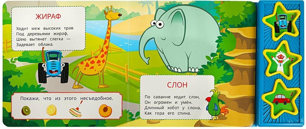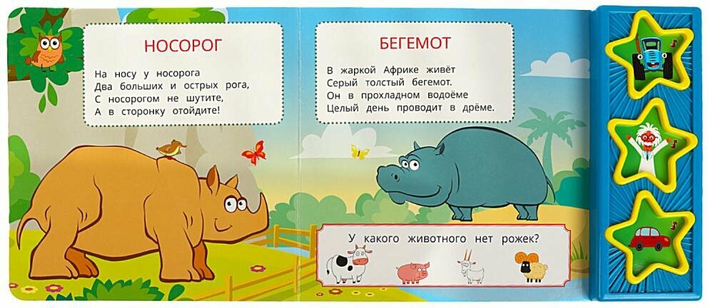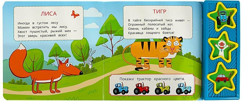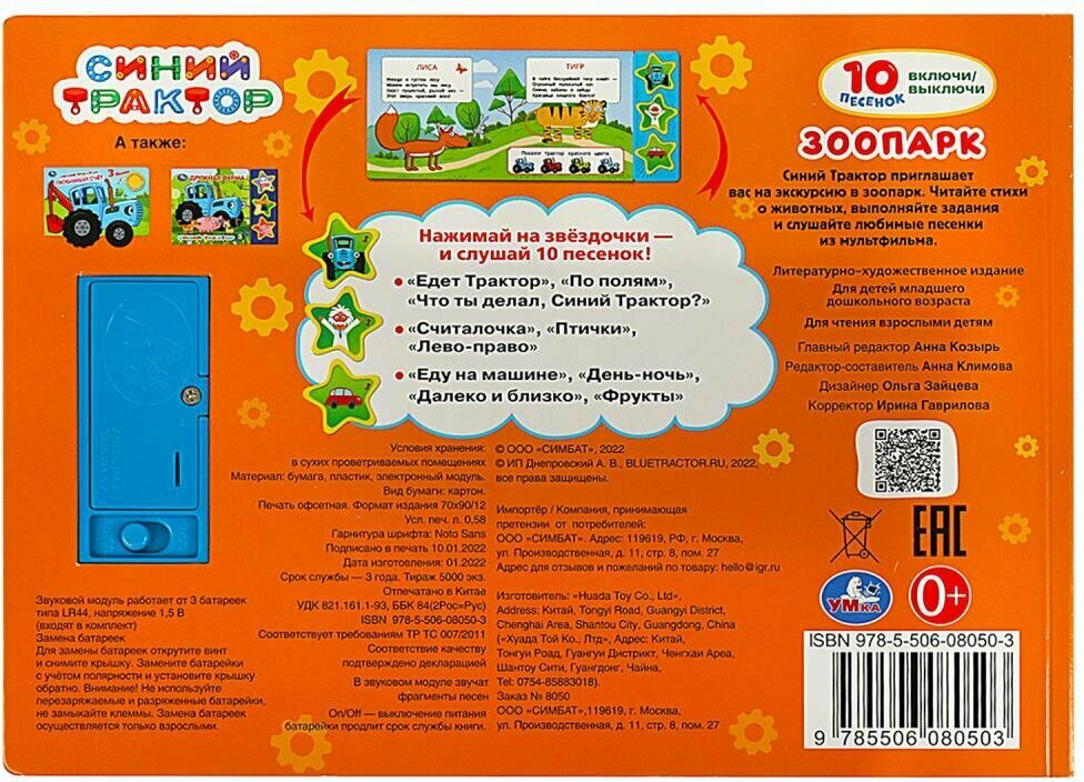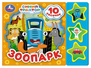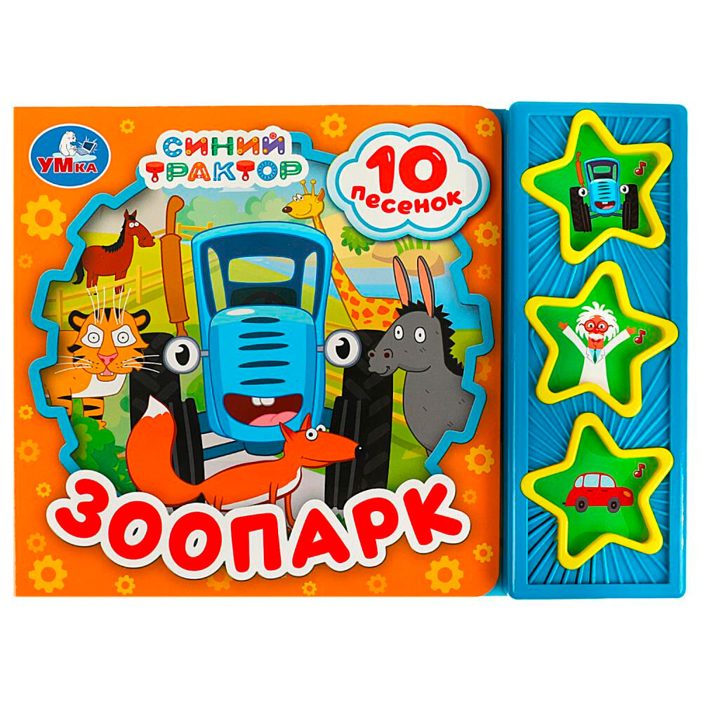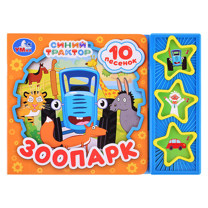 Музыкальная книга «Синий Трактор. Зоопарк» ТМ «УМка» станет отличным подарком для маленьких поклонников мультсериала про весёлых и любознательных котят:- 3 оригинальных звуковых кнопки-звёздочки- 10 песен из м/ф (фрагменты): «По полям», «Едет, едет трактор», «Я весь день работал в поле», «Раз, два, три, четыре, пять, вместе будем мы считать», «Кто, кто, прилетел?», «Лево, право», «Еду на машине», «Что такое сутки», «Далеко и близко», «Пусть и мал наш мандарин»- красочные иллюстрации с любимыми героями- отдельная кнопка Вкл./Выкл. на обороте упаковки- увлекательный сюжетРебёнок с удовольствием будет листать плотные страницы, рассматривать яркие картинки, вместе с родителями читать интересную историю по мотивам мультфильма и, конечно, нажимать на кнопки и слушать весёлые песенки. Малыш легко освоит включение звука: по нажатию на кнопку песенка включится, при втором нажатии выключится. На одной кнопке по 3-4 песенки. Благодаря компактному размеру книгу удобно взять с собой в дорогу.Музыкальная книга ТМ «УМка» расширяет кругозор и развивает:- слуховое восприятие и музыкальный слух- навык чтения- фантазию- образное мышление- память- моторикуОбъём: 6 стр. Формат: 206 х 150 мм.Материал: пластмасса + картон.Работает от 3-х батареек типа LR44 (в комплекте).Рекомендовано детям младшего дошкольного возраста.