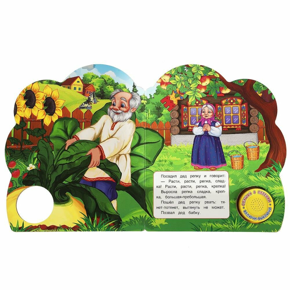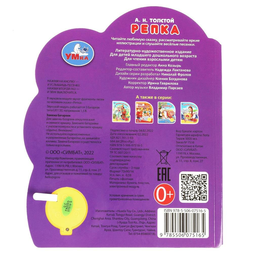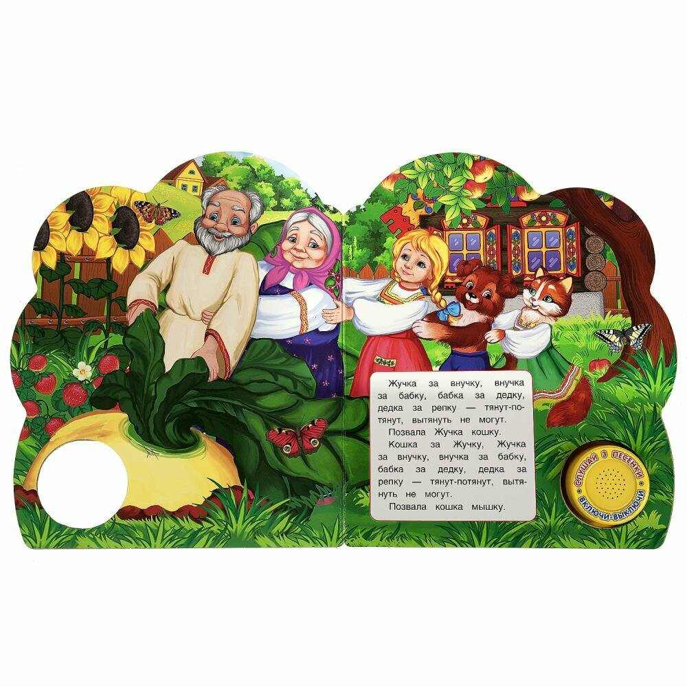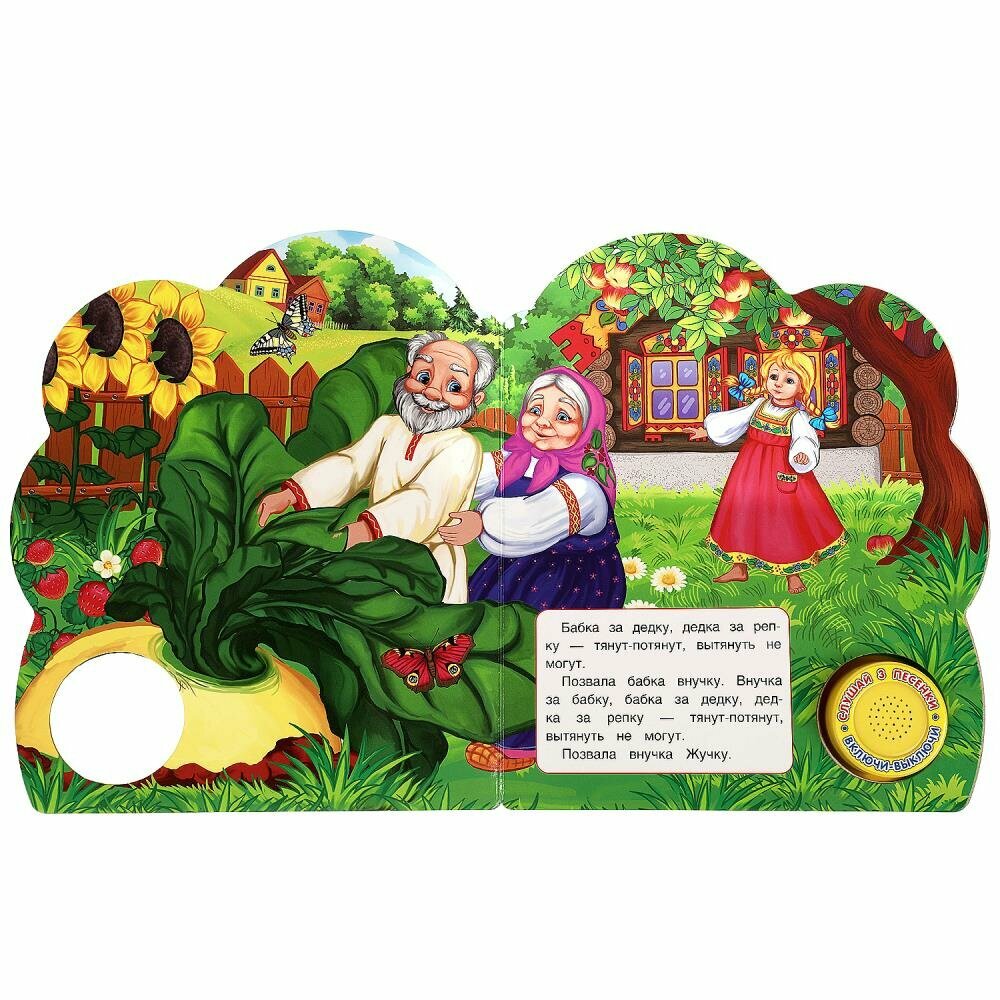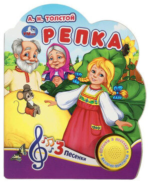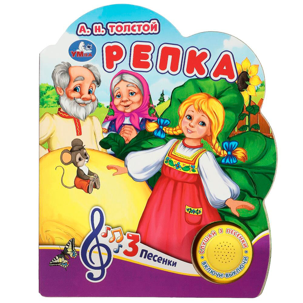 Музыкальная книга «Репка» ТМ «УМка» станет прекрасным подарком для малыша:- в обработке А. Н. Толстого- 1 звуковая кнопка- 3 песенки по мотивам сказки: «Вот тяну я, потяну», «Я к хозяевам пришла», «Тянем, тянем, да потянем»- интересный сюжет- красочные иллюстрации- фигурная вырубкаРебёнок с удовольствием будет листать плотные страницы, рассматривать яркие картинки, вместе с родителями читать известную сказку и, конечно, нажимать на кнопку и слушать весёлые песенки. Малыш легко освоит включение звука: по нажатию на кнопку песенка включится, при втором нажатии выключится, при третьем - заиграет следующая композиция. Благодаря компактному размеру книгу удобно взять с собой в дорогу.Музыкальная книга ТМ «УМка» развивает:- слуховое восприятие- навык чтения- фантазию- образное мышление- памятьОбъём: 8 стр. Формат: 152 х 185 см.Материал: пластмасса + картон.Работает от 3-х батареек типа LR1130 (в комплекте).Рекомендовано детям младшего дошкольного возраста.