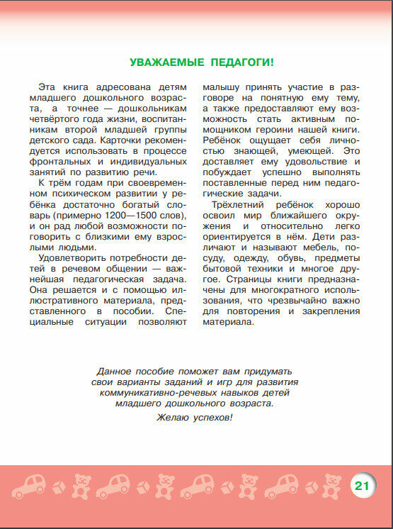 Удовлетворить потребности детей в речевом общении – важнейшая педагогическая задача. Она решается с помощью иллюстративного материала, представленного в пособии. С помощью заданий, предлагаемых в книге, взрослый сможет организовать работу с детьми младшего дошкольного возраста по развитию навыков активной разговорной речи. Работа с пособием способствует формированию произносительных навыков, обогащению словаря, уточнению представлений об окружающем мире. Издание предназначено для.