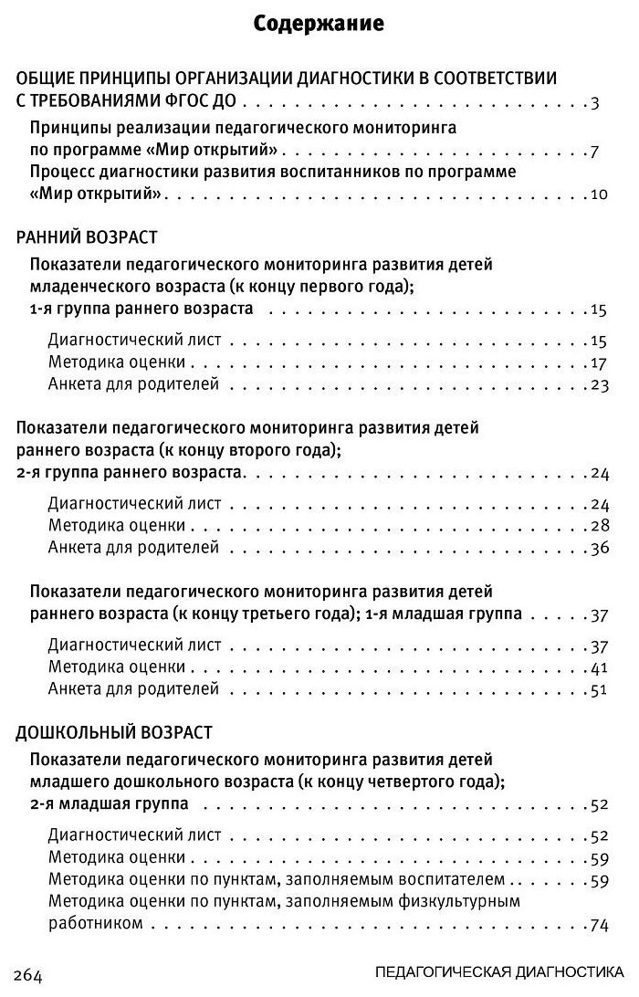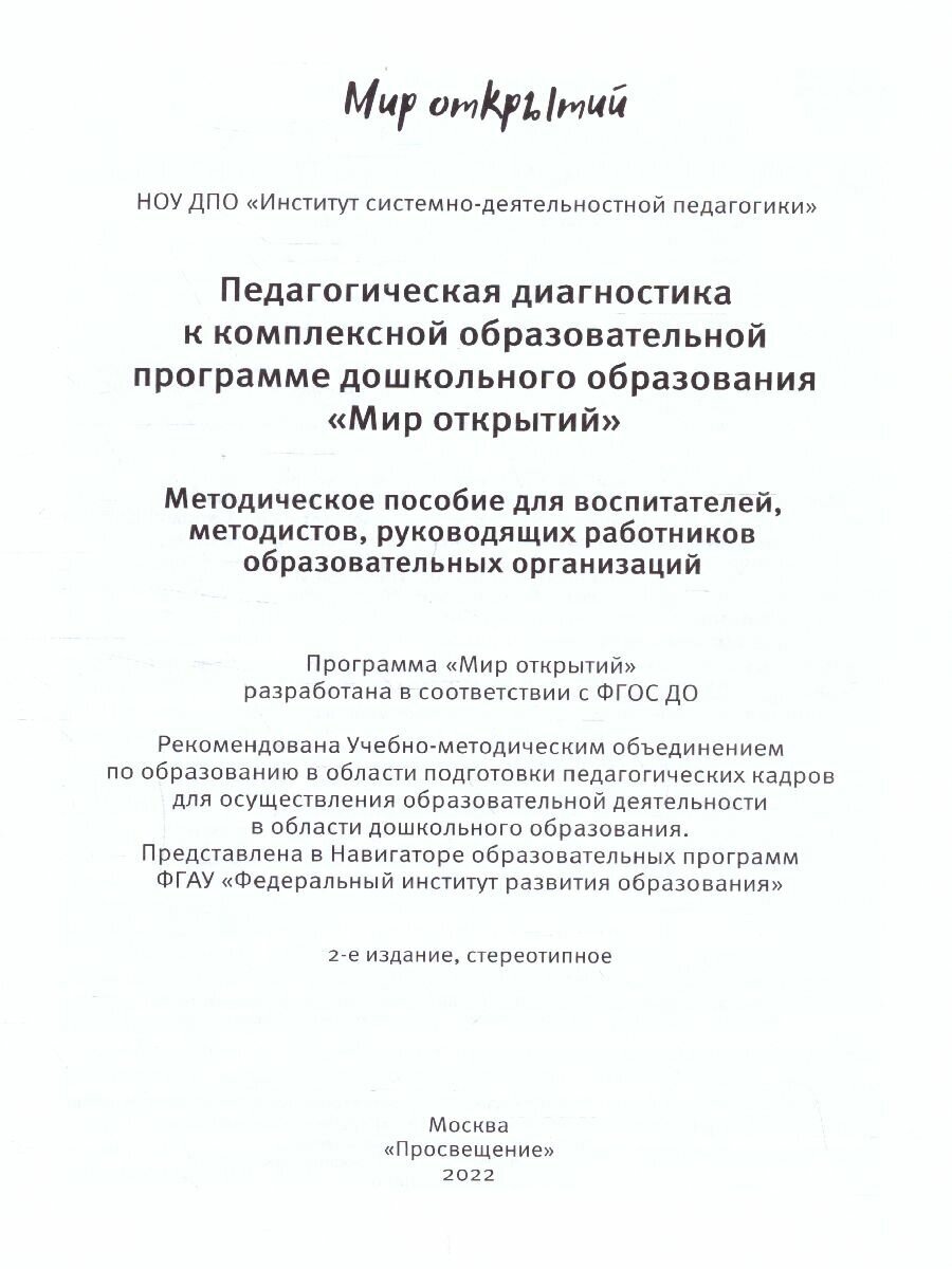 Пособие раскрывает процедуру оценки индивидуального развития детей в рамках реализации комплексной образовательной программы дошкольного образования "Мир открытий". Педагогическая диагностика детей направлена на определение эффективности педагогических действий и соответствия образовательных условий, созданных в образовательной организации, возможностям и индивидуальным особенностям воспитанников. Результаты педагогической диагностики позволяют оптимизировать условия развития детей, определить индивидуальные образовательные траектории и, при необходимости, осуществить их коррекцию. Адресуется воспитателям, методистам, руководителям дошкольных образовательных организаций, специалистам системы повышения квалификации, студентам педагогических колледжей и вузов, гувернерам, родителям. Пособие будет полезно в работе семейных и частных детских садов.