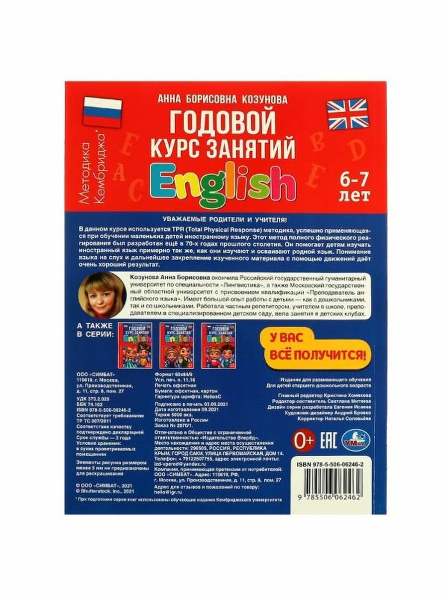 Книга «А. Б. Козунова. Английский язык. Годовой курс занятий, 6-7 лет» ТМ «УМка» – интересное обучающее пособие для изучения иностранного языка детьми:- методика Кембриджа- увлекательные задания- красочное оформление- мягкая обложкаАвтор этого пособия, Анна Борисовна Козунова - лингвист с большим опытом работы обучения детей английскому языку, в том числе и дошкольников. В данном годовом курсе используется методика, успешно применяющаяся при обучении маленьких детей иностранному языку и помогающая им изучать и осваивать его также как и родной язык. Понимание языка на слух и дальнейшее закреплении изученного материала с помощью движений обеспечивает высокую эффективность обучения.Занятия по учебному пособию ТМ «УМка» будут способствовать развитию:- моторики рук- сенсорики- внимания- мышления- логики- памятиОбъём: 96 стр. Формат: 205 х 280 мм.Материал: офсетная бумага.Рекомендовано детям 6-7 лет.