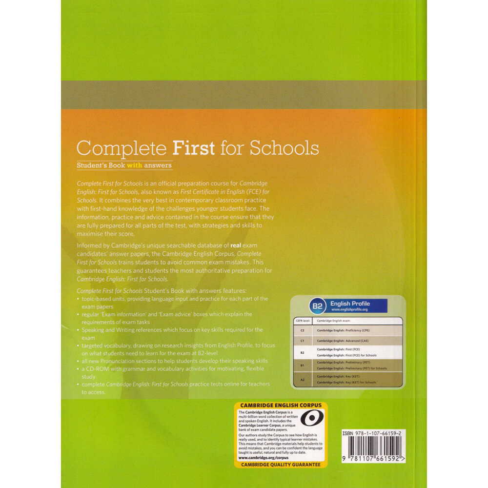 This Student"s Book combines the very best in contemporary classroom practice with engaging topics aimed at younger students. The information, practice and advice contained in the course ensure that they are fully prepared for all parts of the test, with strategies and skills to maximise their score. Informed by Cambridge"s unique searchable database of real exam candidates" answers, the Cambridge English Corpus, Complete First for Schools includes examples and exercises which tackle common problem areas at this level. The CD-ROM contains grammar and vocabulary exercises for motivating, flexible study. Class Audio CDs, available separately, contain the recordings for listening exercises.