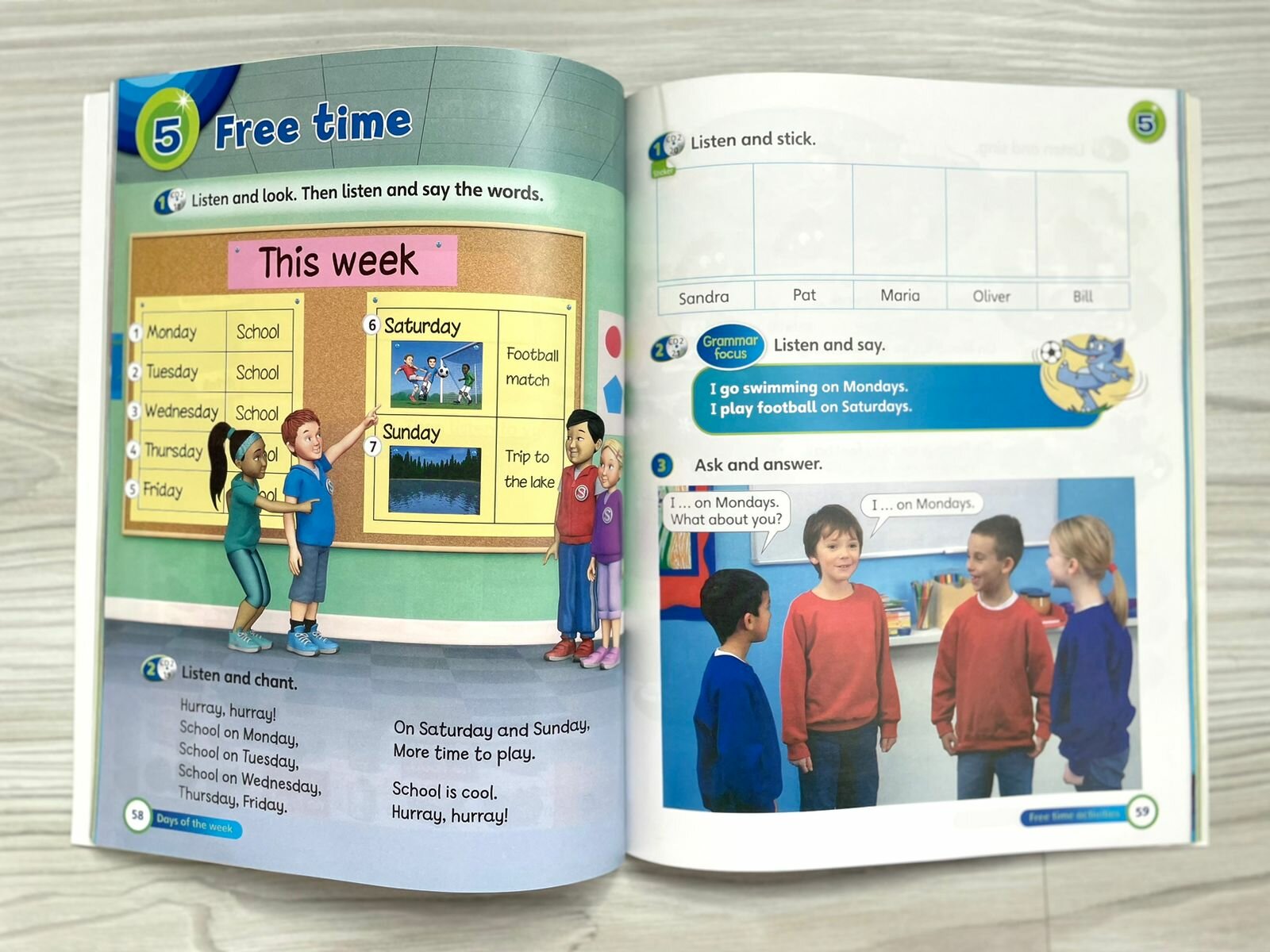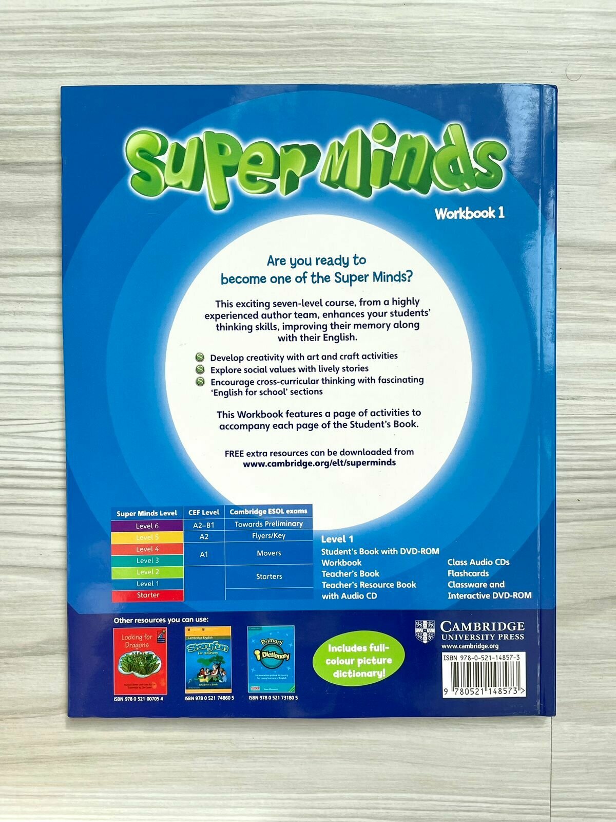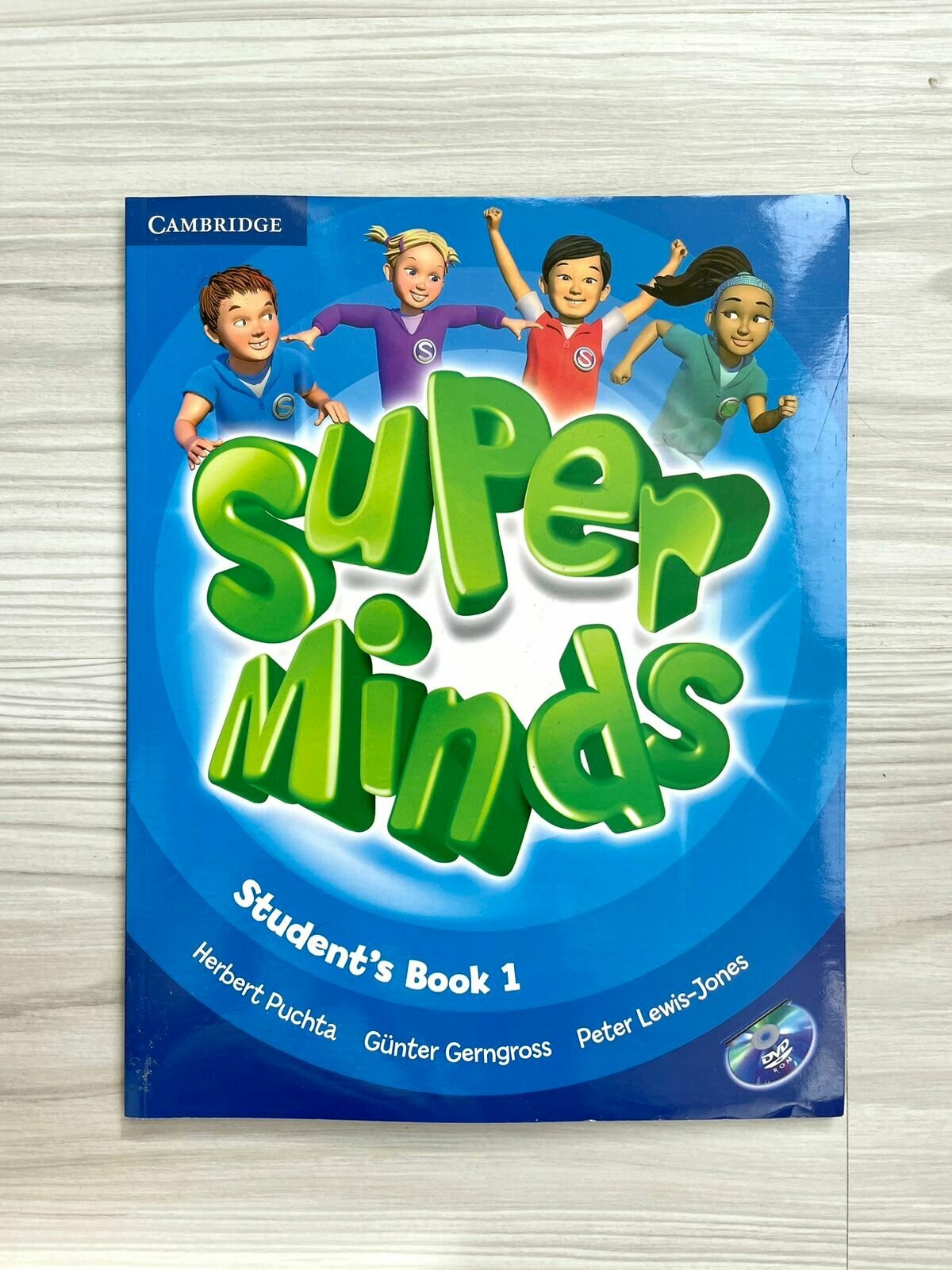 Учебник Super Minds 1 содержит: лексика: диалоги знакомства, цвета, числительные – до 10, классная комната, игрушки, животные и среда обитания, еда, дни недели и свободное время, одежда, мое тело, праздники (темы перекликаются с предыдущим уровнем, но изучаются глубже); грамматика: структуры «I like/ I don’t like», «There is/ There are», «I can/ I can't», «Let’s», «Where is/ are», предлоги, Present Continuous и Present Simple, краткий утвердительный и отрицательный ответ, специальные вопросы; типы заданий: повторение в конце каждого урока на базе межпредметных связей, интерпретация и понимание увиденного и прочитанного, отбор информации, сравнение, предположение, классификация, самоидентификация, анализ утверждений, рисование, игра в танграм; наклейки и рисунки для вырезания; DVD-ROM диск: видео, игры, песни с караоке.