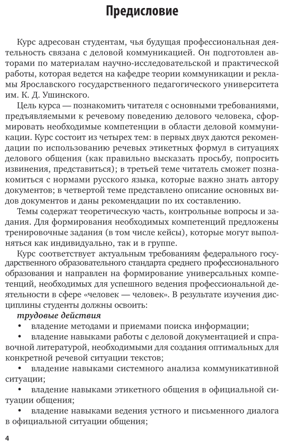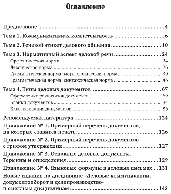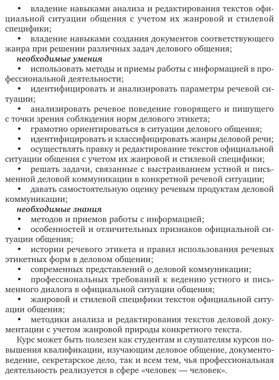 В курсе рассматриваются основные требования, предъявляемые к речевому поведению делового человека. Раскрываются необходимые компетенции в области деловой коммуникации. Представлены рекомендации по использованию речевых этикетных формул в ситуациях делового общения, нормы русского языка, которые важно знать автору документов, также включено описание основных видов документов и даны рекомендации по их составлению. Соответствует актуальным требованиям федерального государственного образовательного стандарта среднего профессионального образования и профессиональным требованиям. Курс ориентирован на студентов и слушателей программ профессиональной переподготовки и повышения квалификации, изучающих деловое общение, документоведение, секретарское дело.
