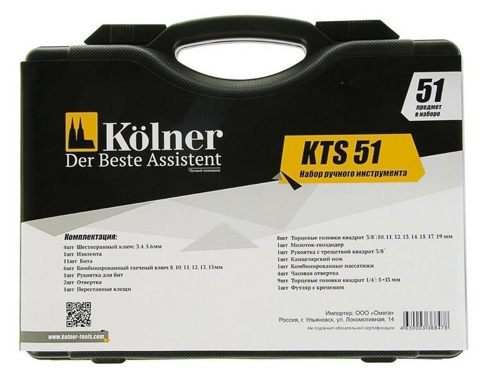 Набор инструментов Kolner привлекателен хорошим подбором ручного инструмента и универсален, в его состав вошло в общей сложности 51 изделие. Вошедшие в этот комплект предметы изготовлены из хромованадиевой инструментальной стали, обеспечившей им стойкость к износу, деформации под нагрузками, коррозии. В наборе специалисты и умельцы-любители найдут торцевые головки, гаечные ключи, насадки-биты, пассатижи и переставные клещи и еще многое другое.