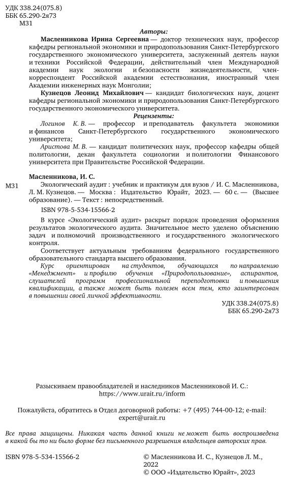 Книга Экологический аудит (Масленникова Ирина Сергеевна; Кузнецов Леонид Михайлович); ЮРАЙТ, 2022