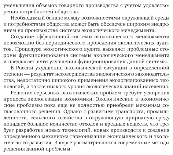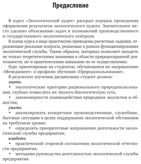 В курсе "Экологический аудит" раскрыт порядок проведения оформления результатов экологического аудита. Значительное место уделено объяснению задач и полномочий производственного и государственного экологического контроля. Соответствует актуальным требованиям федерального государственного образовательного стандарта высшего образования. Курс ориентирован на студентов, обучающихся по направлению "Менеджмент" и профилю обучения "Природопользование", аспирантов, слушателей программ профессиональной переподготовки и повышения квалификации, а также может быть полезен всем тем, кто заинтересован в повышении своей личной эффективности.