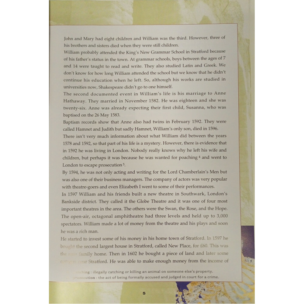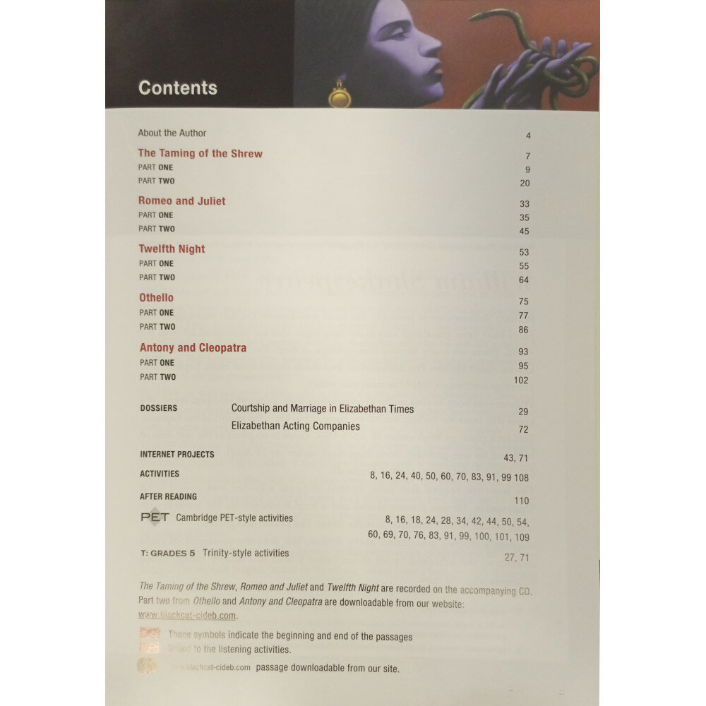 William ShakespeareAdapted by Jennifer GascoigneLove In The Taming of the Shrew, Katharina learns to love Petruchio only after she has learnt to be an obedient wife. Romeo and Juliet’s love is destined to end in tragedy. In Twelfth Night, love is romantic but also painful, while in Othello love turns into jealousy. And in the final story, Antony and Cleopatra’s passionate love has tragic consequences.