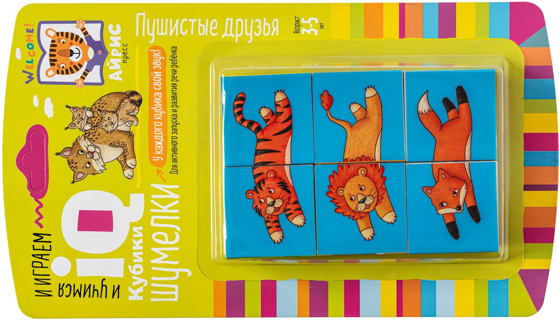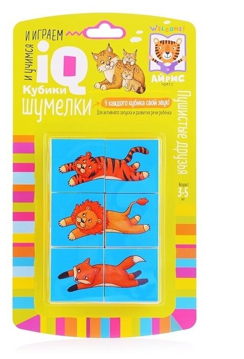 Набор состоит из 6 кубиков, из которых можно сложить 6 картинок с изображением животных. Особенность кубиков в том, что картинки складываются в форме не только привычного прямоугольника, но и других фигур. Благодаря различным наполнителям каждый кубик издаёт свой звук. Ребёнок учится различать звуки, их громкость, отбивать ритм, слушает ритмические стихи. В процессе игры развиваются фонематический слух, активная речь, мышление, умение работать по образцу, происходит знакомство с понятиями "часть и целое". Наклейки на кубики сделаны из качественной гладкой бумаги, которая не портится от игры.Адресовано детям от 3 до 5 лет.